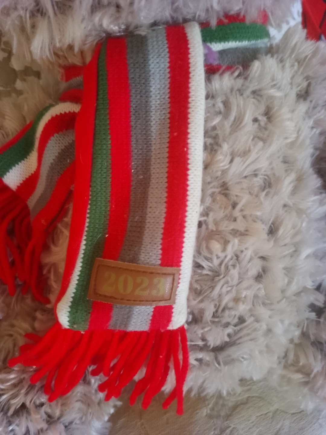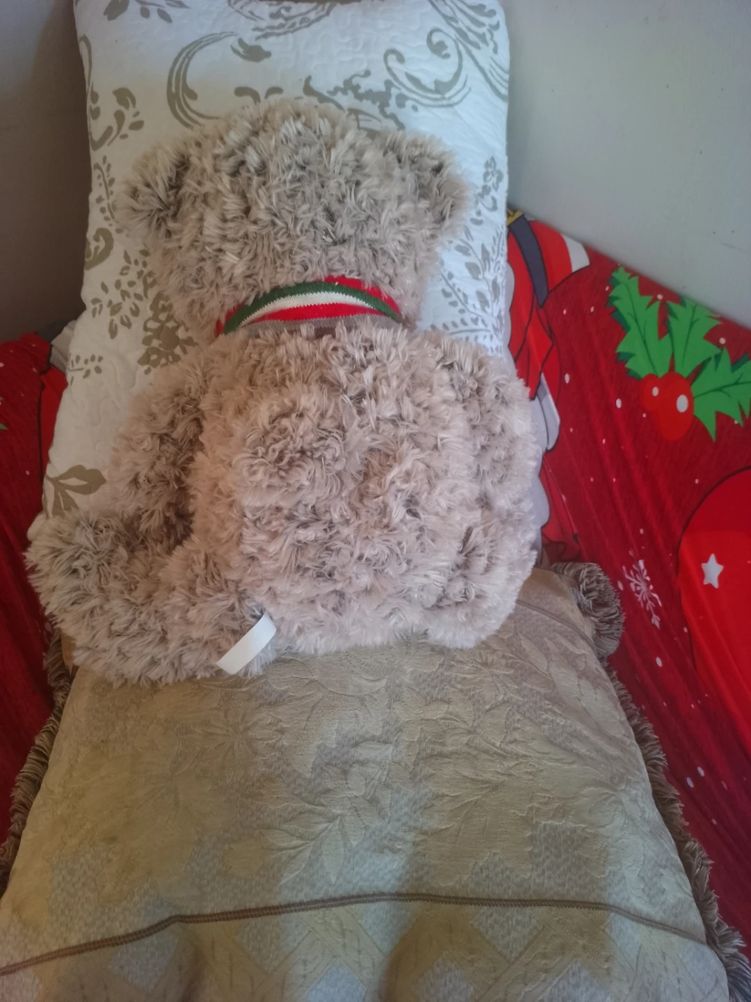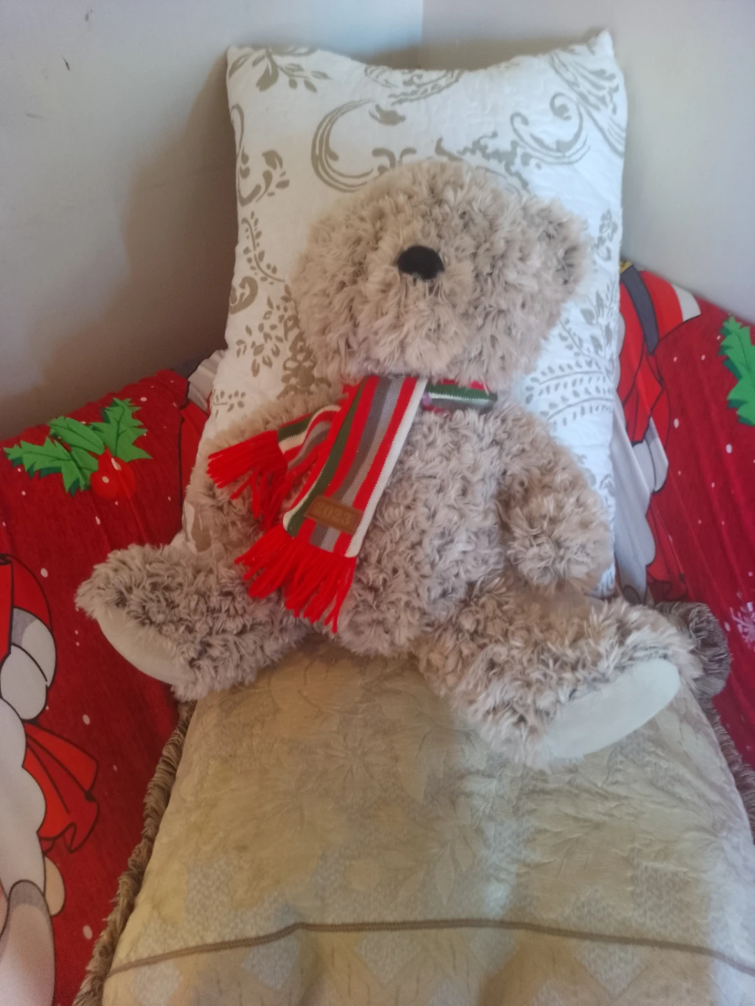 A cute teddy bear is up for grabs! This plush toy is in great condition and comes with a festive scarf. Perfect for cuddling or as a decorative piece