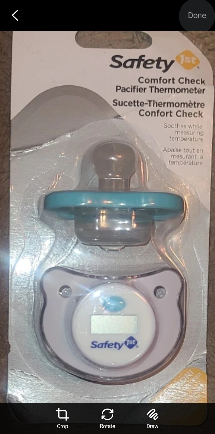 I'm selling a brand new Safety 1st Comfort Check Pacifier Thermometer! It soothes while measuring temperature, and it's still in its original packaging