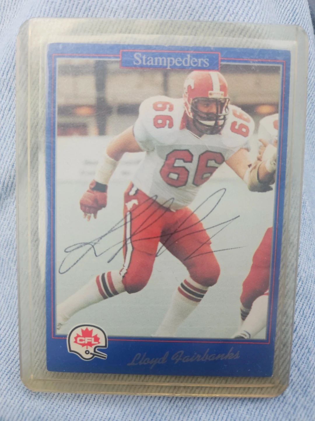 Selling a Lloyd Fairbanks #66 football card. He played Offensive Tackle for the Calgary Stampeders. He is 6'4" and weighs 245 lbs. He played 17 years as a pro. This card is from JOGO INC./91