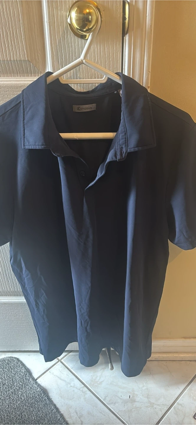Here's a gently used navy blue polo shirt from Kyodan. It's in great condition and ready for a new home!