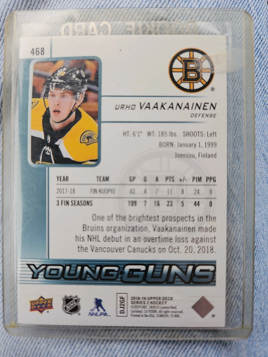 Selling an Urho Vaakanainen Young Guns rookie card. It features Vaakanainen in his Bruins jersey. Great for any hockey card collector!