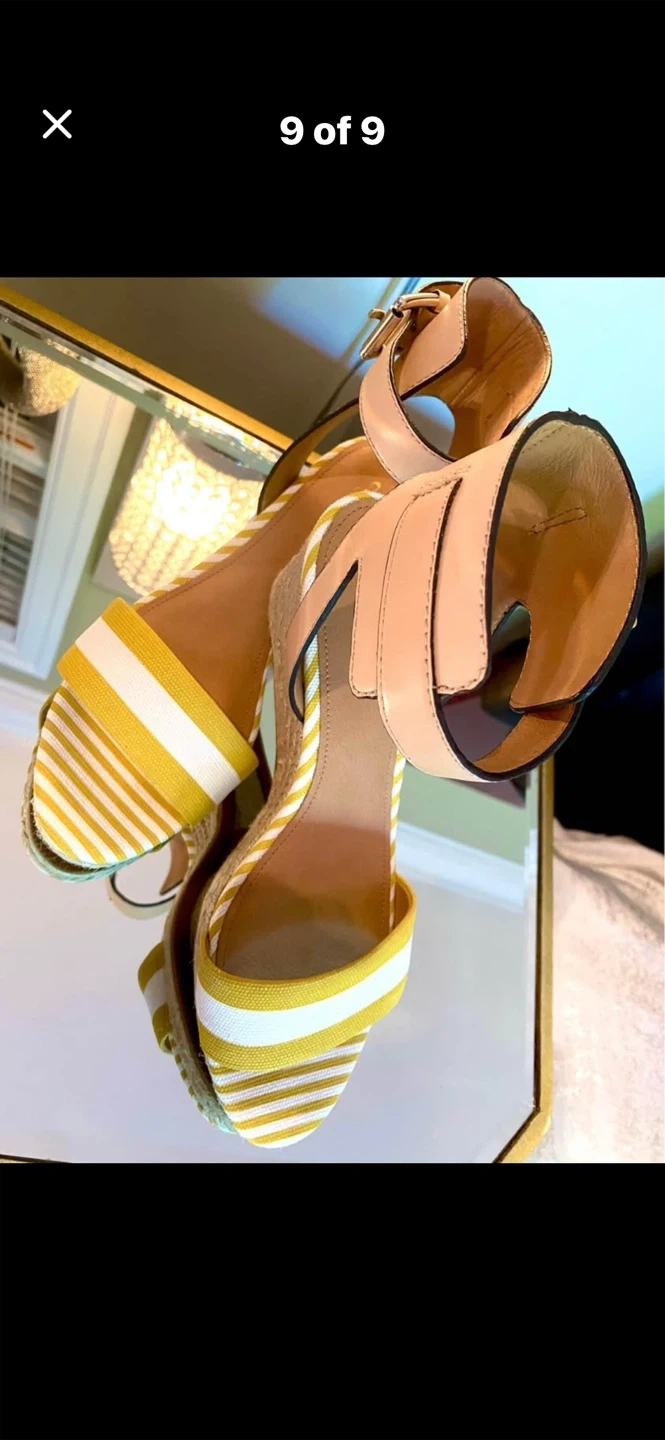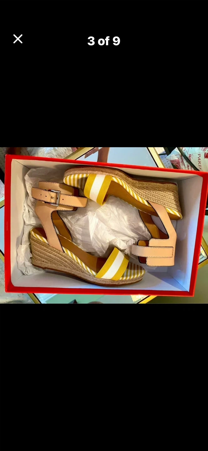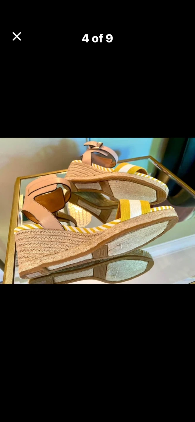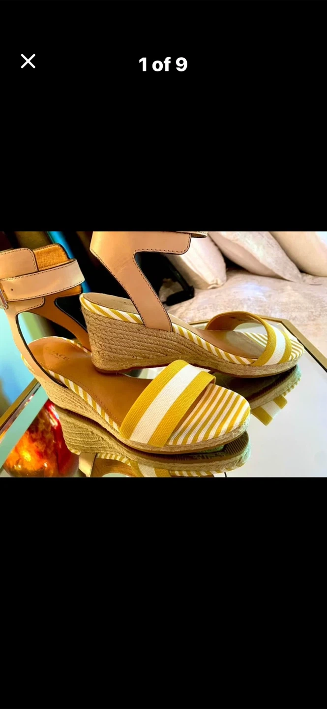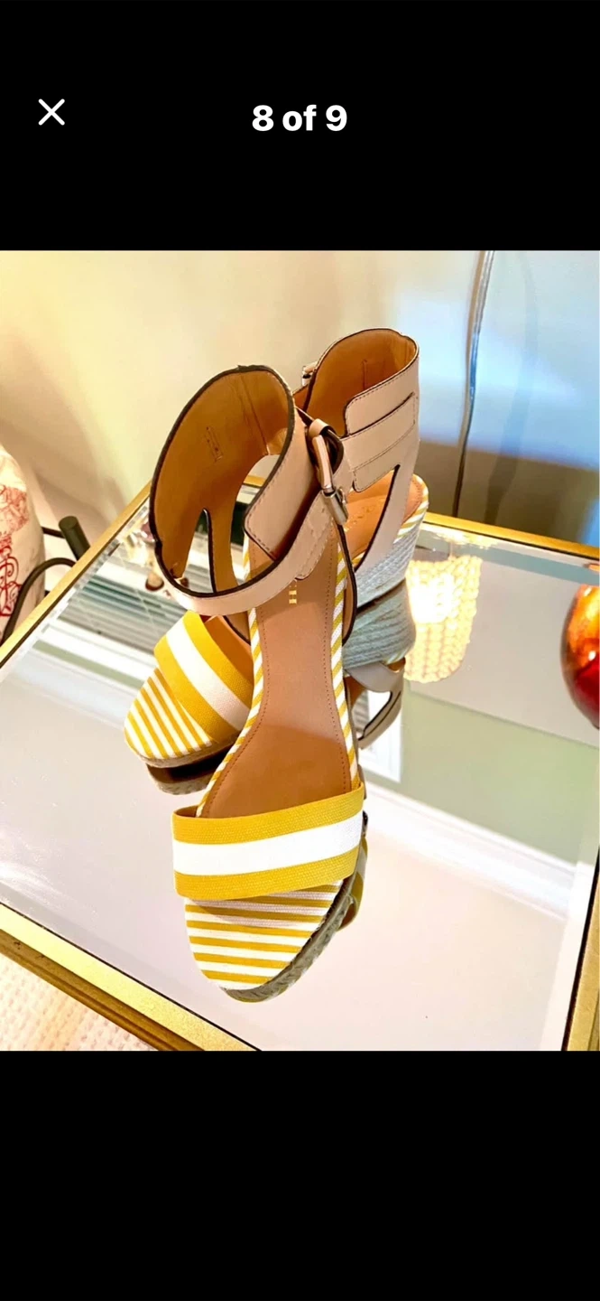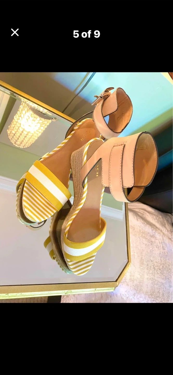 💛Selling a pair of Coach Helen Getwy Cab Strp/Lthr sandals in size 8.5. These stylish wedges feature a sunglow/white/natural colour combination. They come with the original box!💛