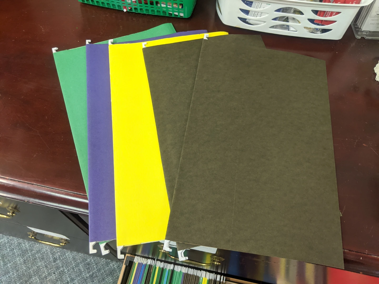 Selling a bunch of hanging file folders in assorted colours! They're are all brand new and ready to help you get organized in your home office or workspace