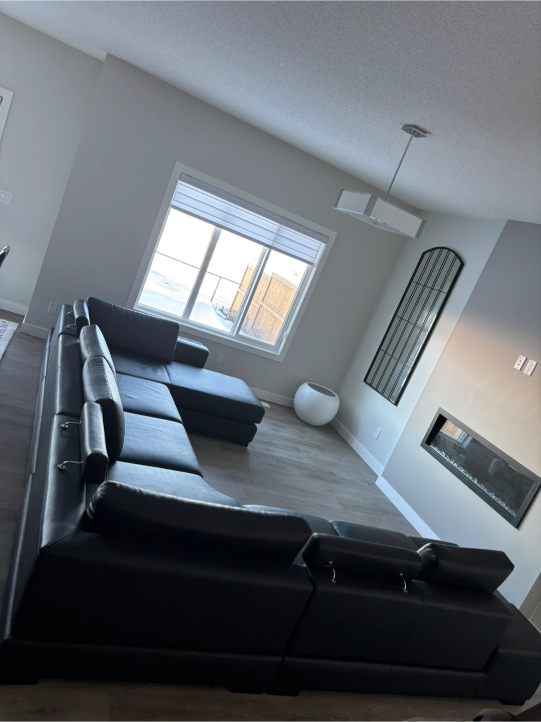Selling a black leather sectional sofa. This modern piece would be a great addition to any living room. It's in great condition and ready for a new home!