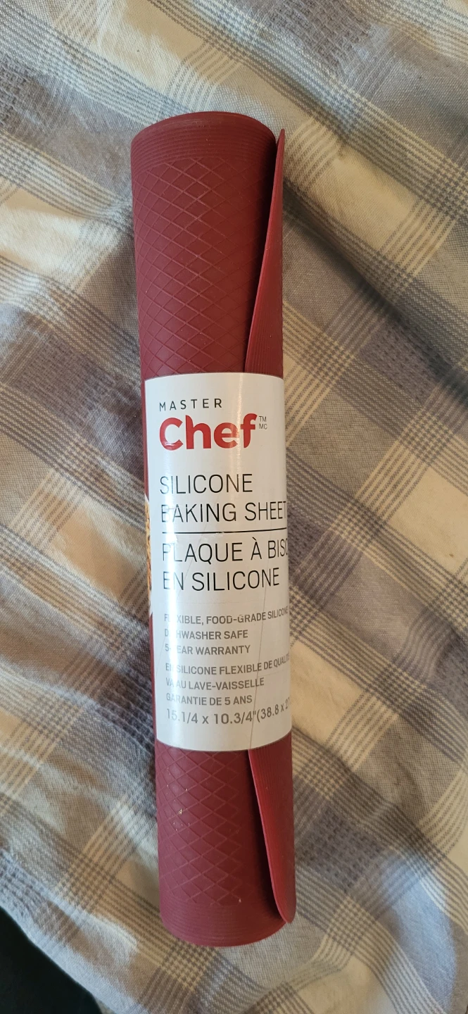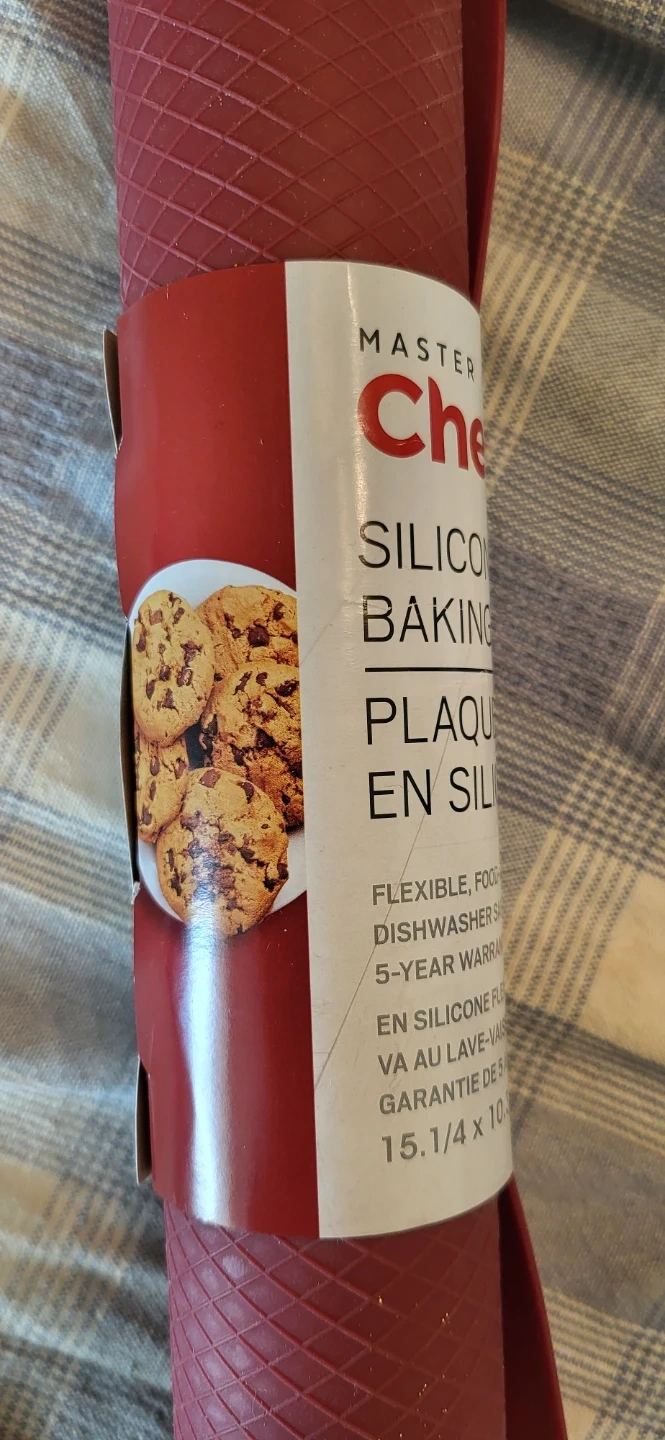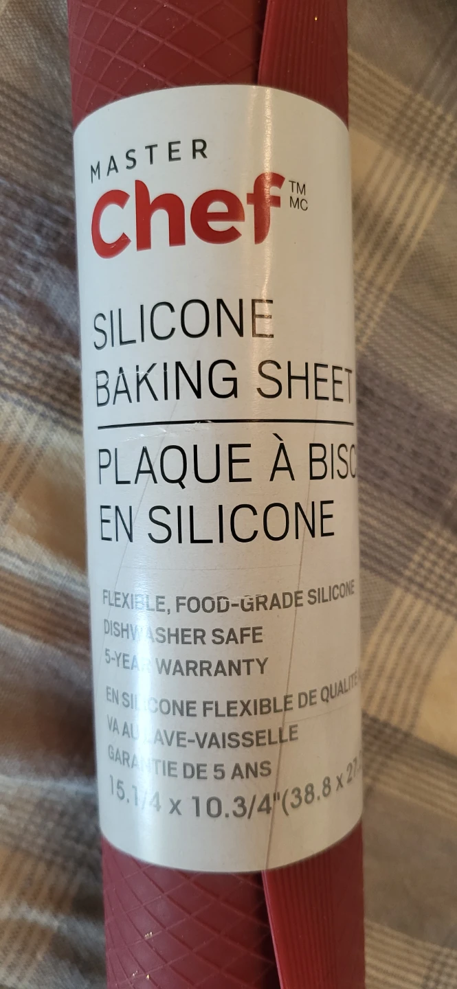 I'm selling a Master Chef silicone baking sheet. It's flexible and made of food-grade silicone. It's also dishwasher safe and comes with a 5-year warranty. The dimensions are 15.1/4 x 10.3/4" (38.8 x 27.3 cm)