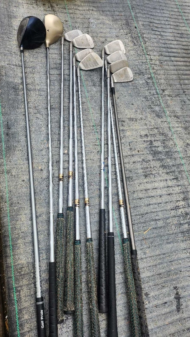 This set of golf clubs is ready to hit the greens! Each club varies in length and head design to cover a range of shots. They've been well-loved, showing signs of use that don't affect their performance.