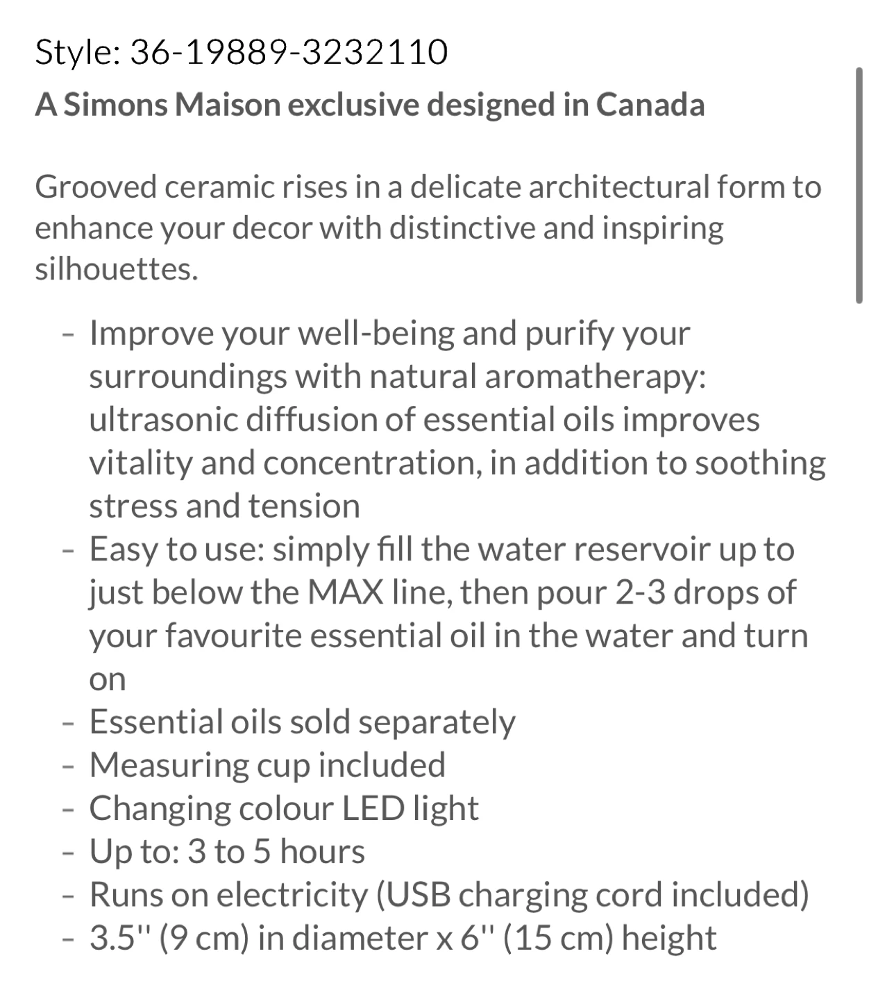 Selling this beautiful fluted ultrasonic diffuser from Simons Maison!