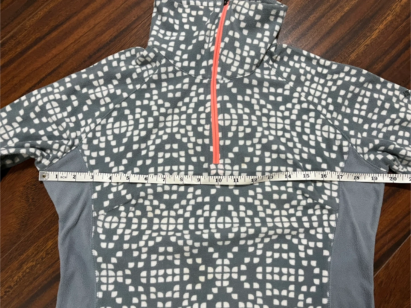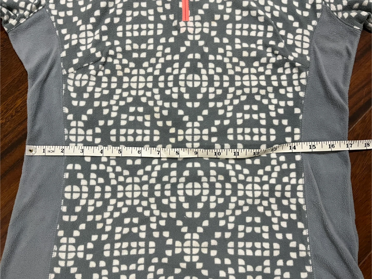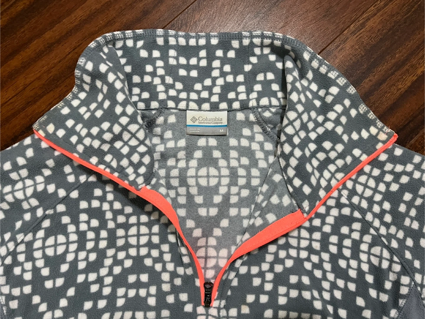 Columbia women’s quarter-zip fleece pullover sweater in size medium. Grey and white abstract pattern with contrast pink zipper trim and solid grey side panels. Excellent condition from a smoke free home.