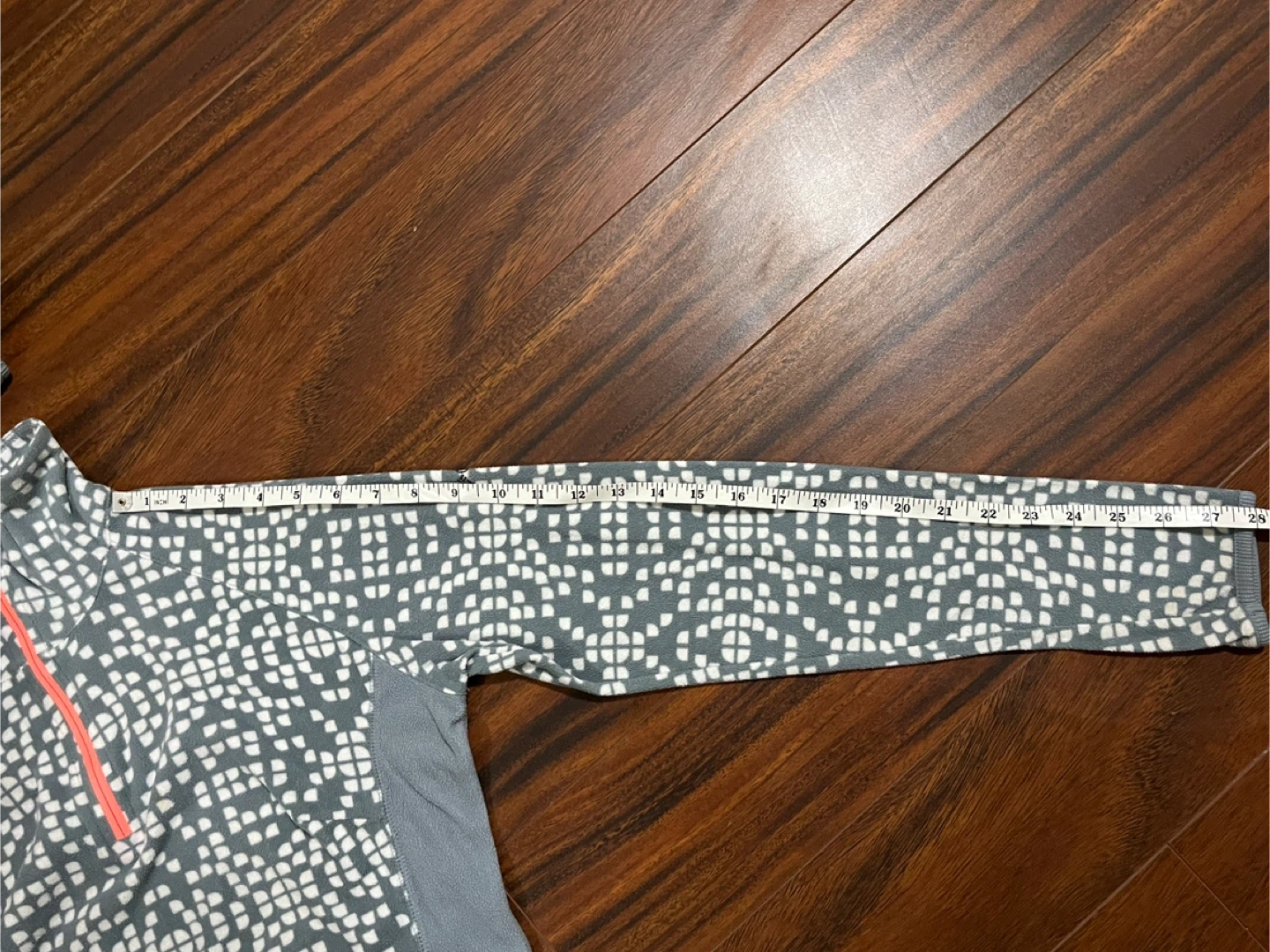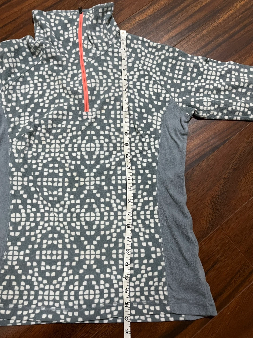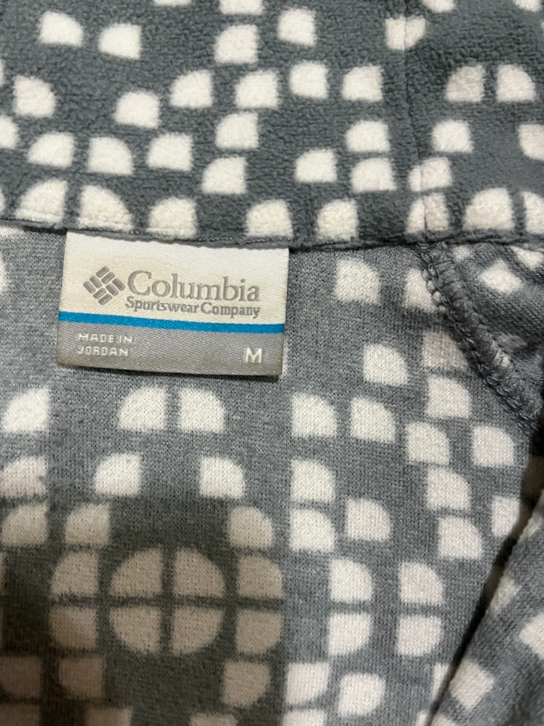 Columbia women’s quarter-zip fleece pullover sweater in size medium. Grey and white abstract pattern with contrast pink zipper trim and solid grey side panels. Excellent condition from a smoke free home.