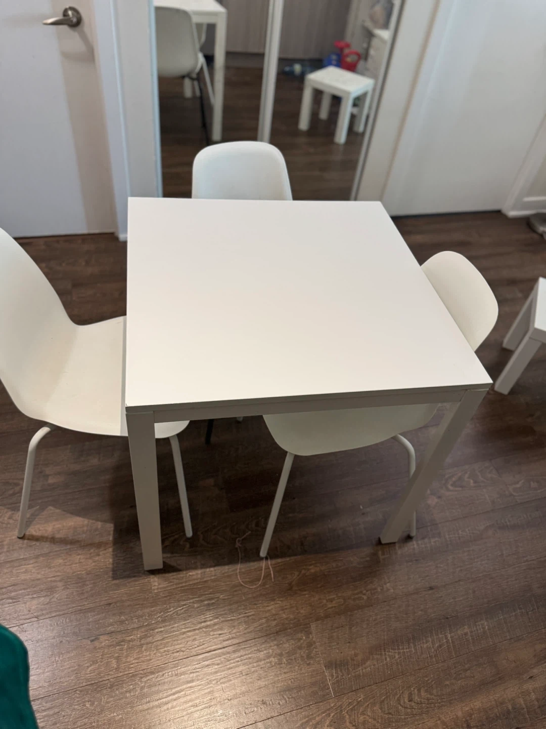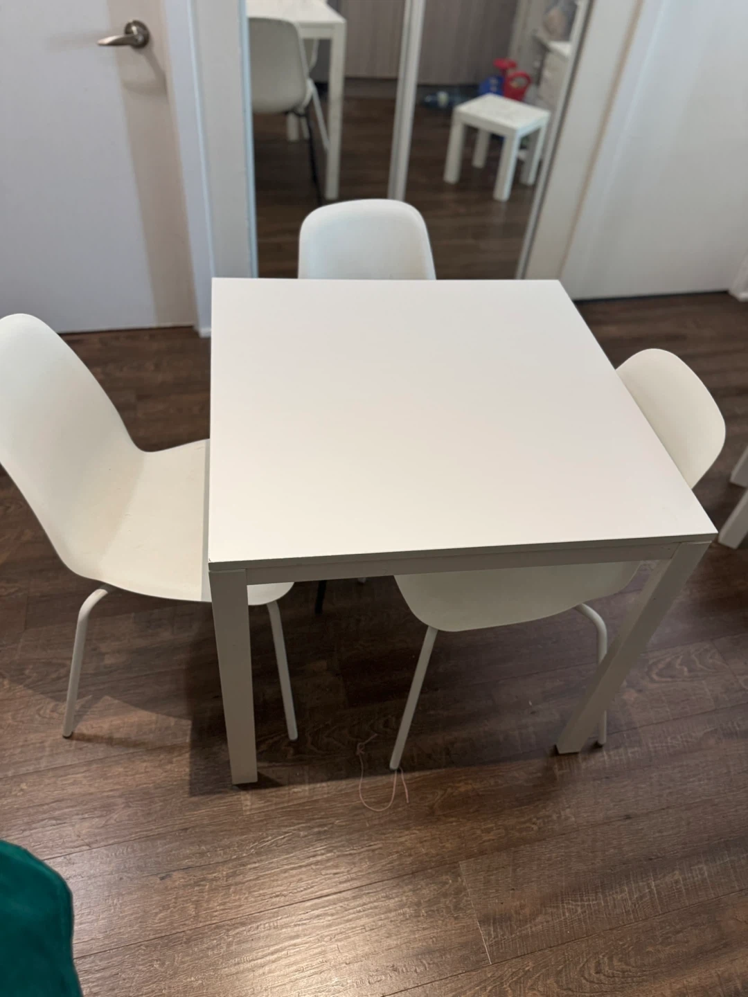 Selling a Ikea white dining table with 3 chairs. It's a simple and clean set that would look great in any kitchen or dining area. The set is in good condition and ready for a new home!
