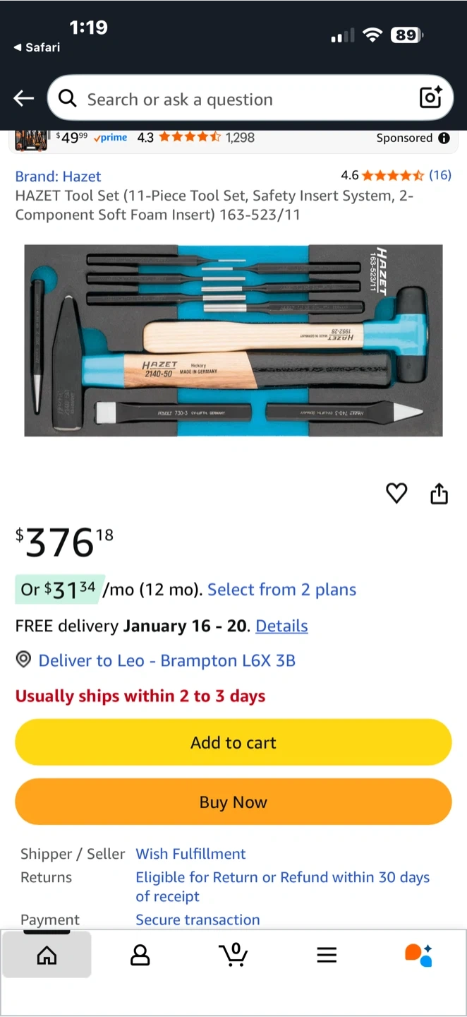 Selling a HAZET 11-Piece Tool Set, complete with a safety insert system. It features a 2-component soft foam insert to keep everything organized. The original price was $376.18.