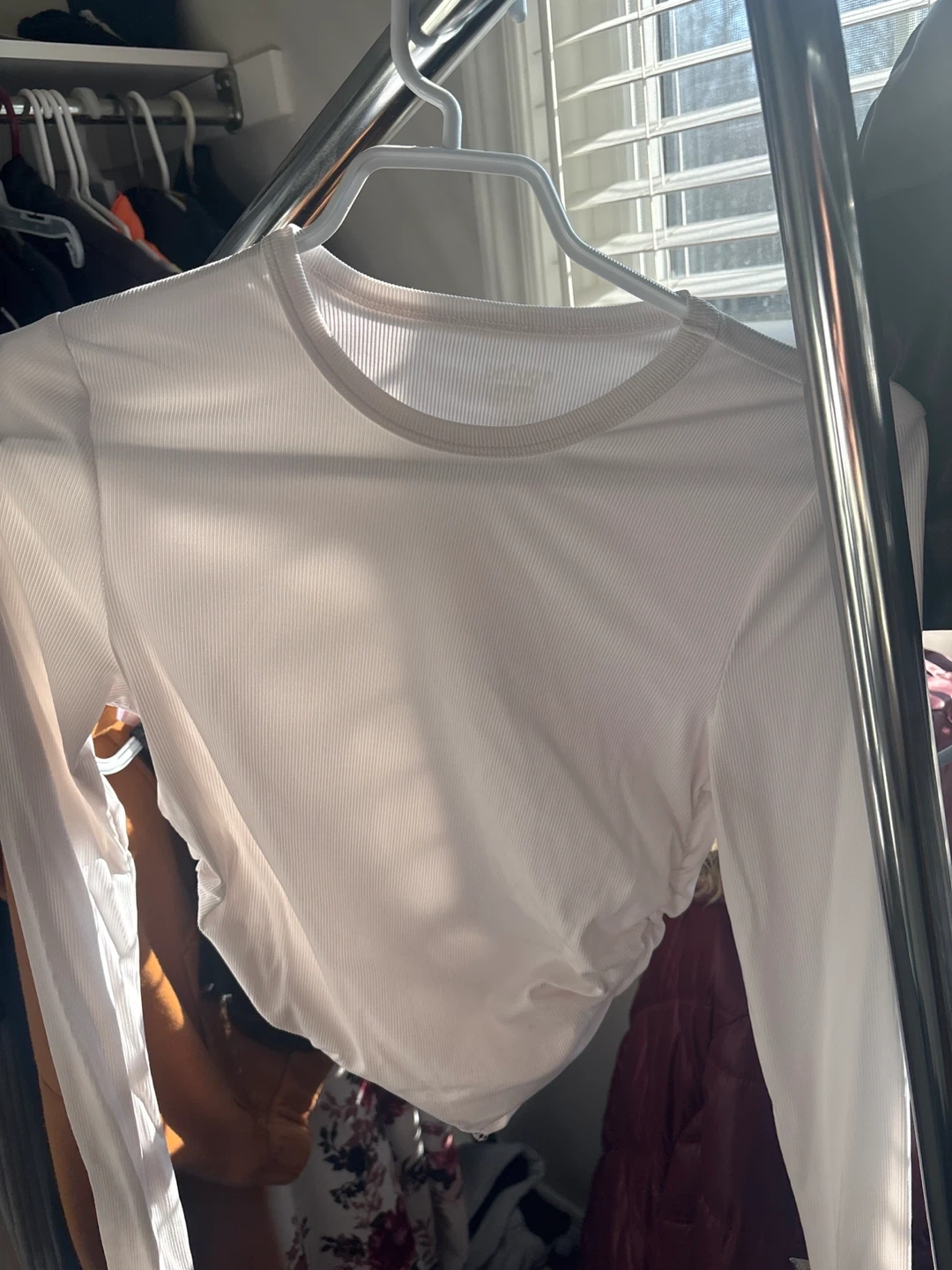 Selling a cute white long sleeve crop top! It's in great condition and ready for a new wardrobe. The material is soft and comfortable, perfect for layering or wearing on its own