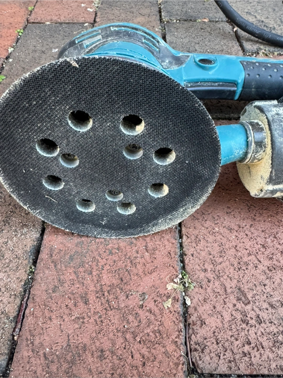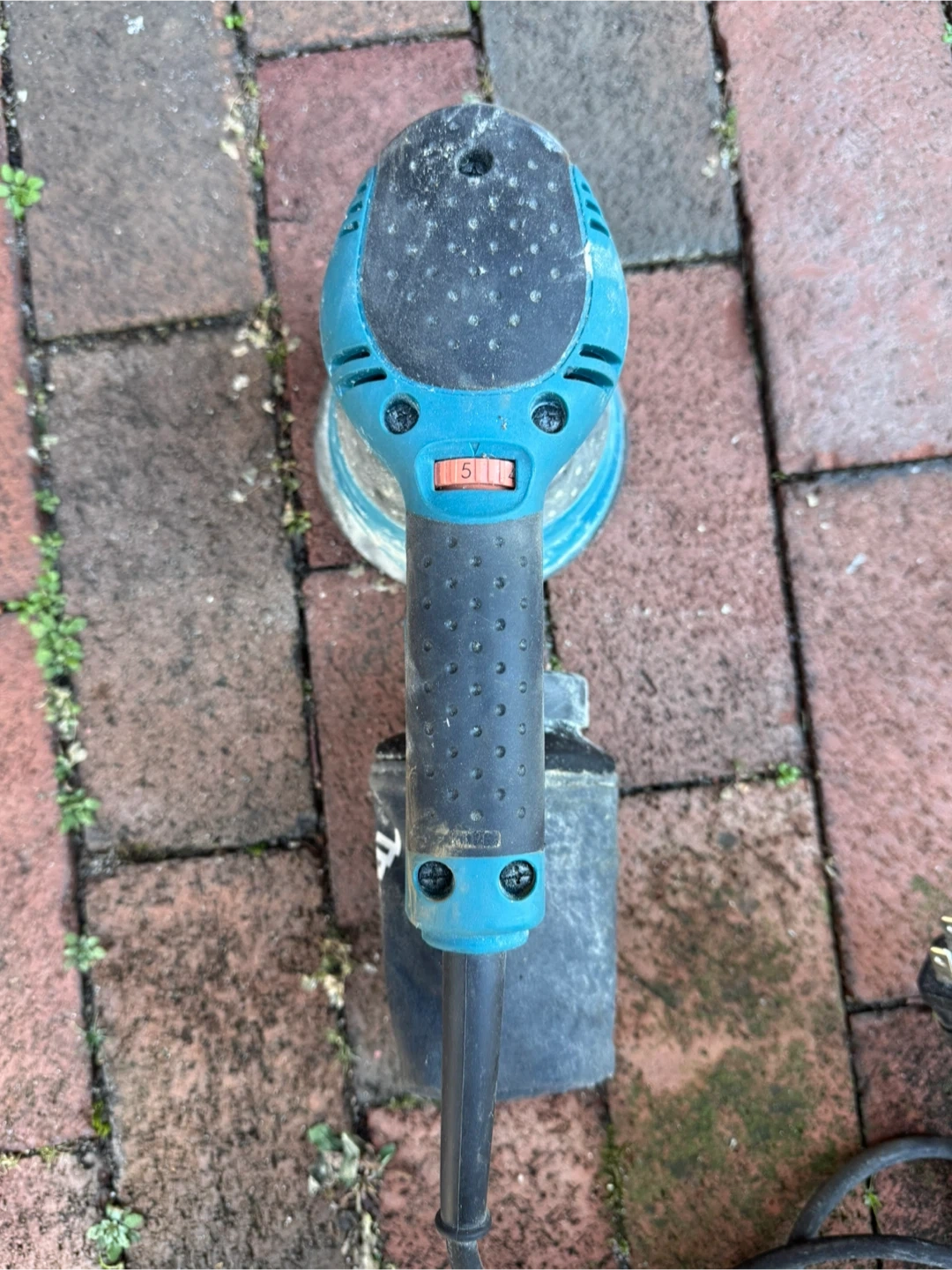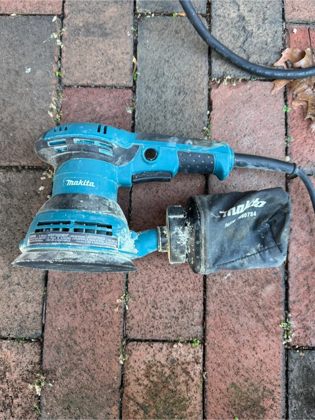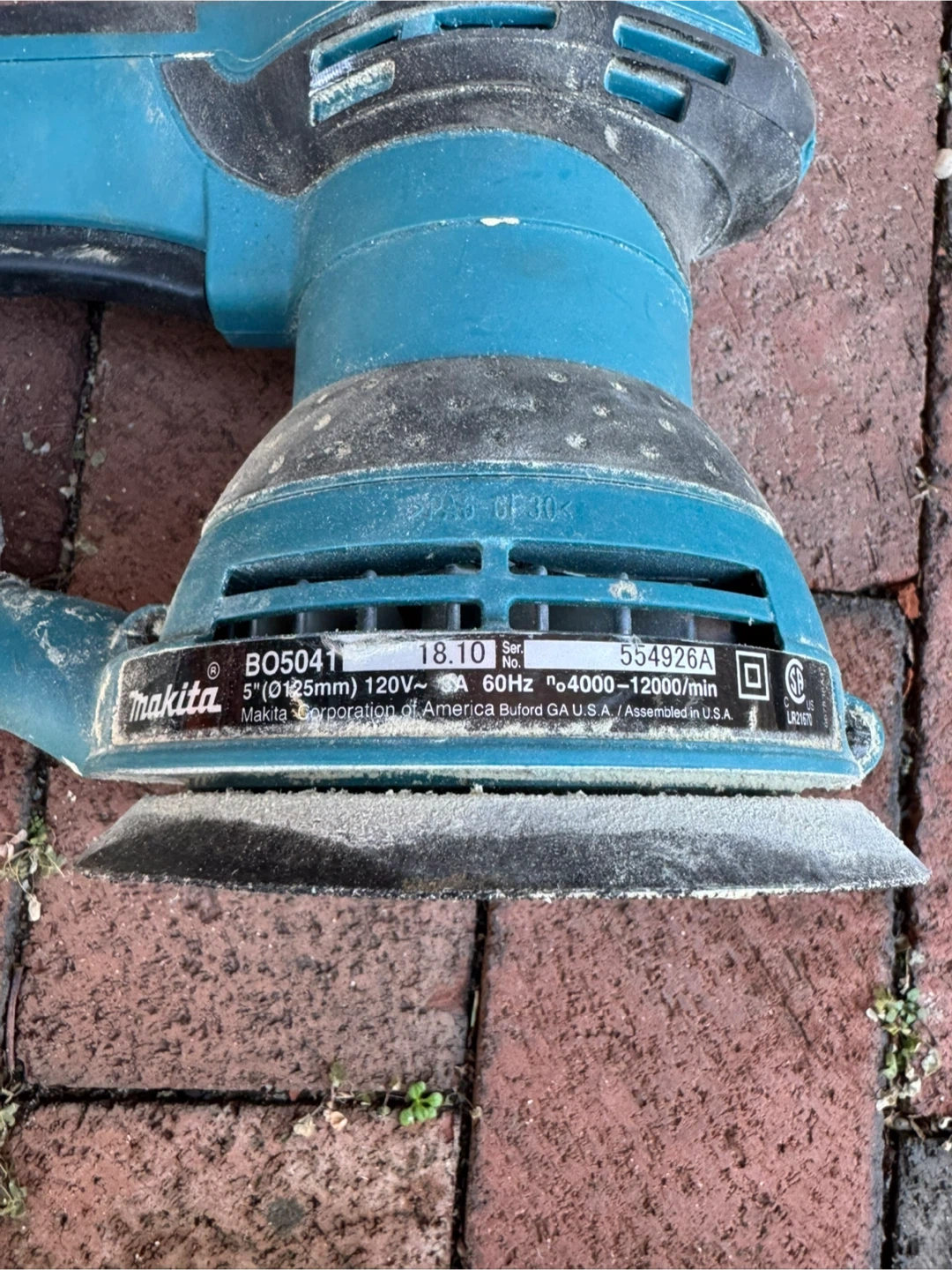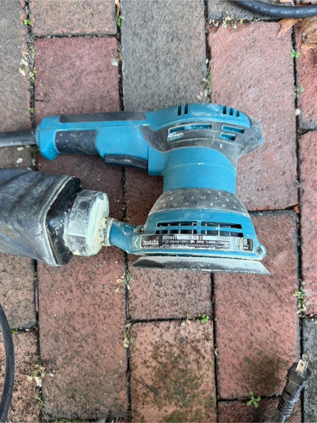 Selling a used Makita BO5041 5" Random Orbit Sander. It operates at 120V and 60Hz, with a speed range of 4000-12000/min. Includes a dust bag.