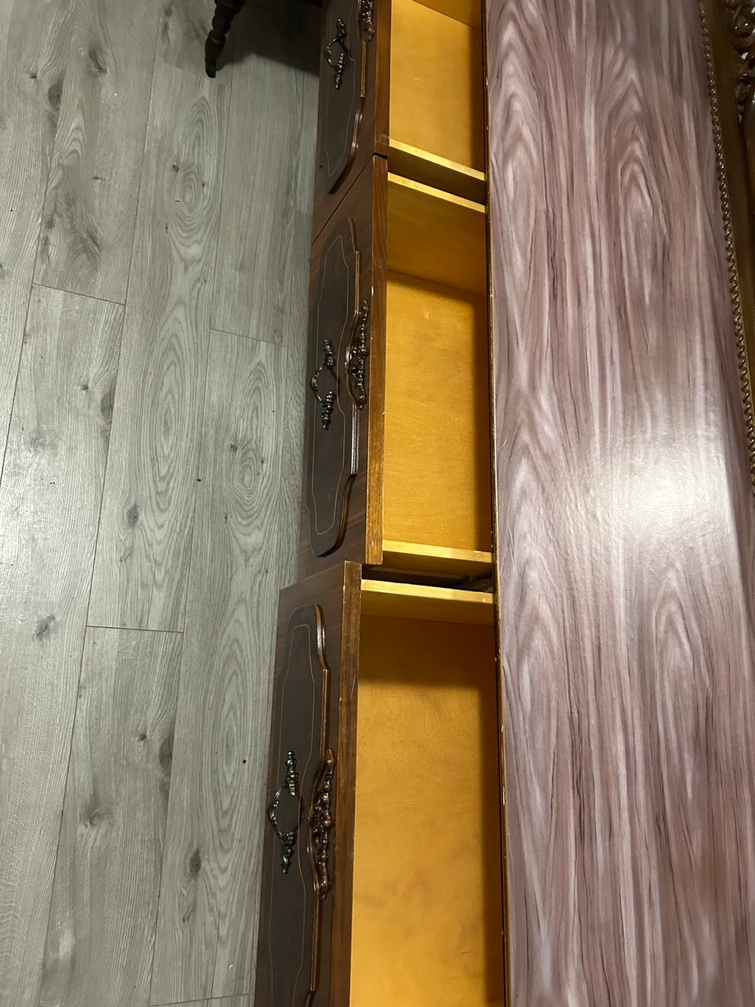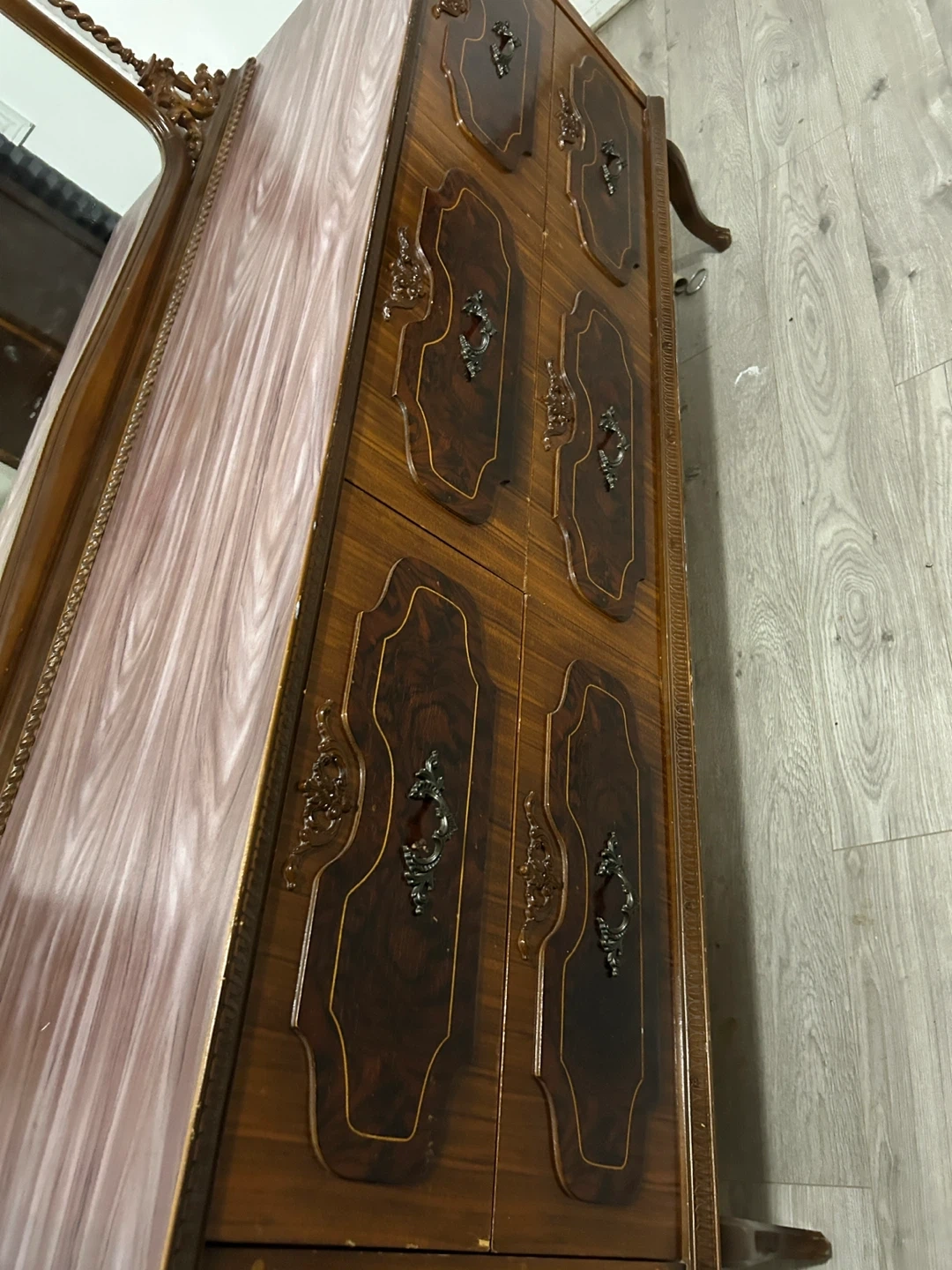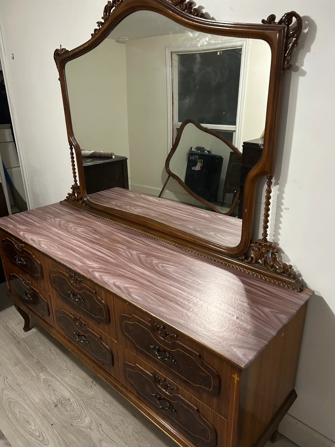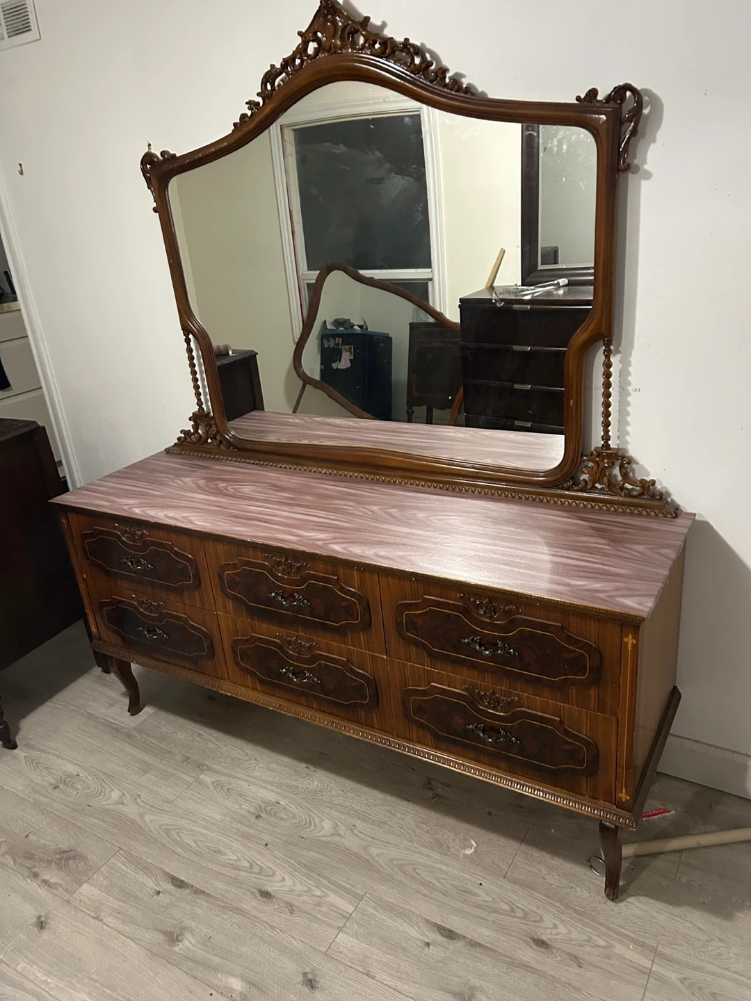 Selling an antique vanity with a mirror. It has a unique, ornate design and a beautiful dark wood finish. It features multiple drawers for storage. It's in good condition for its age, with some signs of wear that add to its vintage charm