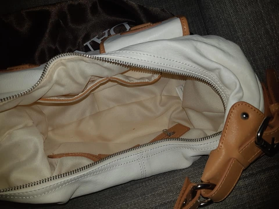 Brand new! Danier leather purse. 2 front pockets with clasp, 2 inside pockets and 1 inside zipper pocket. Tan/cream colour.
