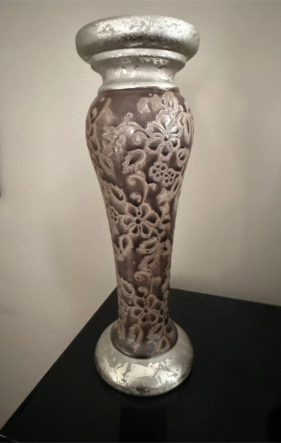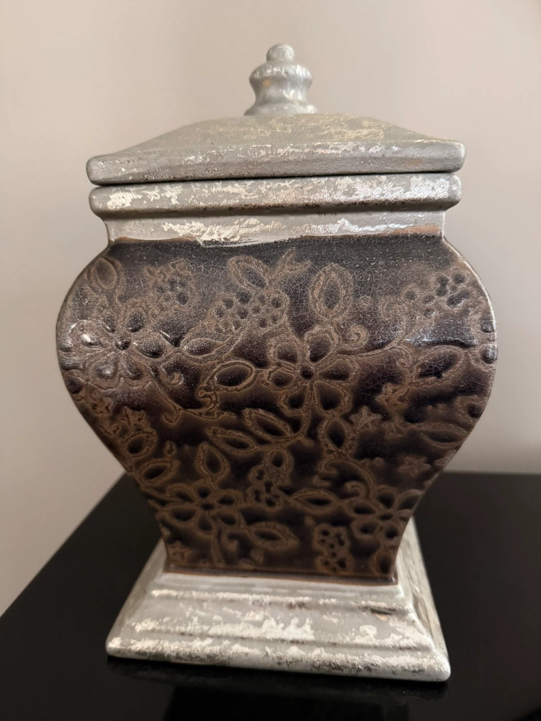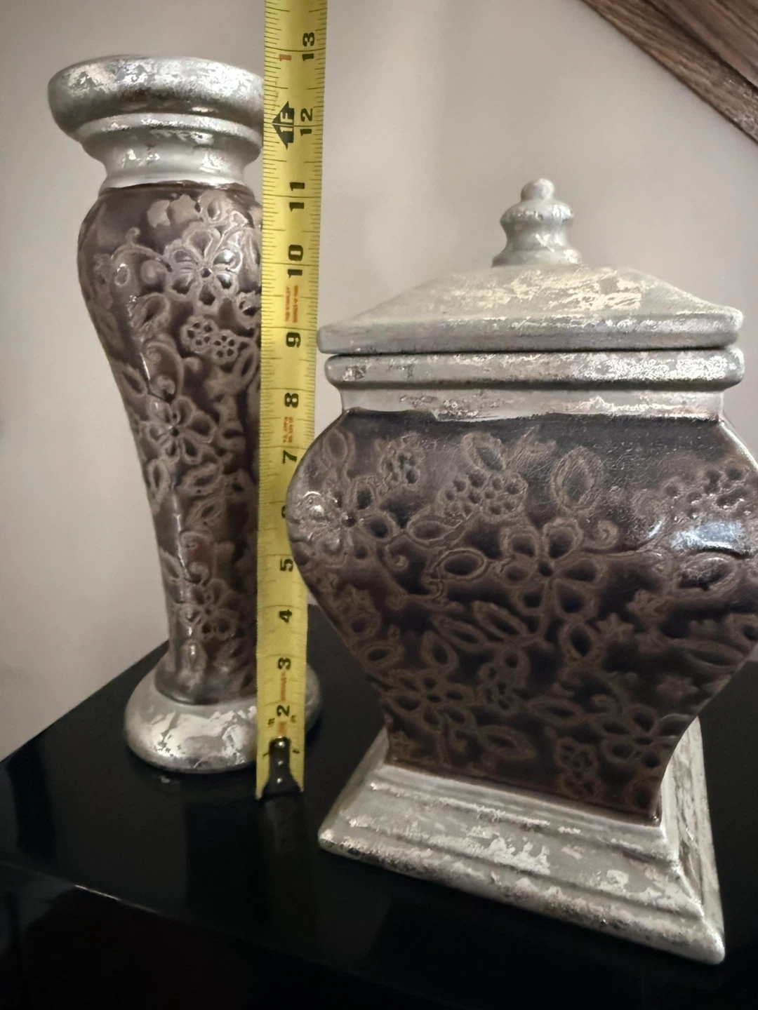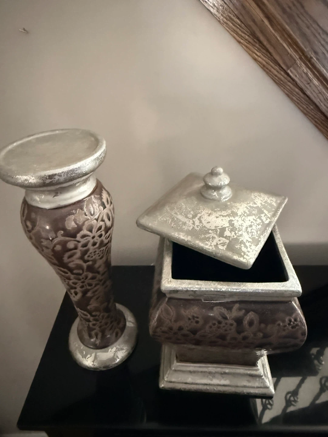 Selling a decorative vase and box set in brown and silver. The vase is approximately 12 inches tall. Both pieces have a floral pattern. They would make a lovely addition to your home decor
