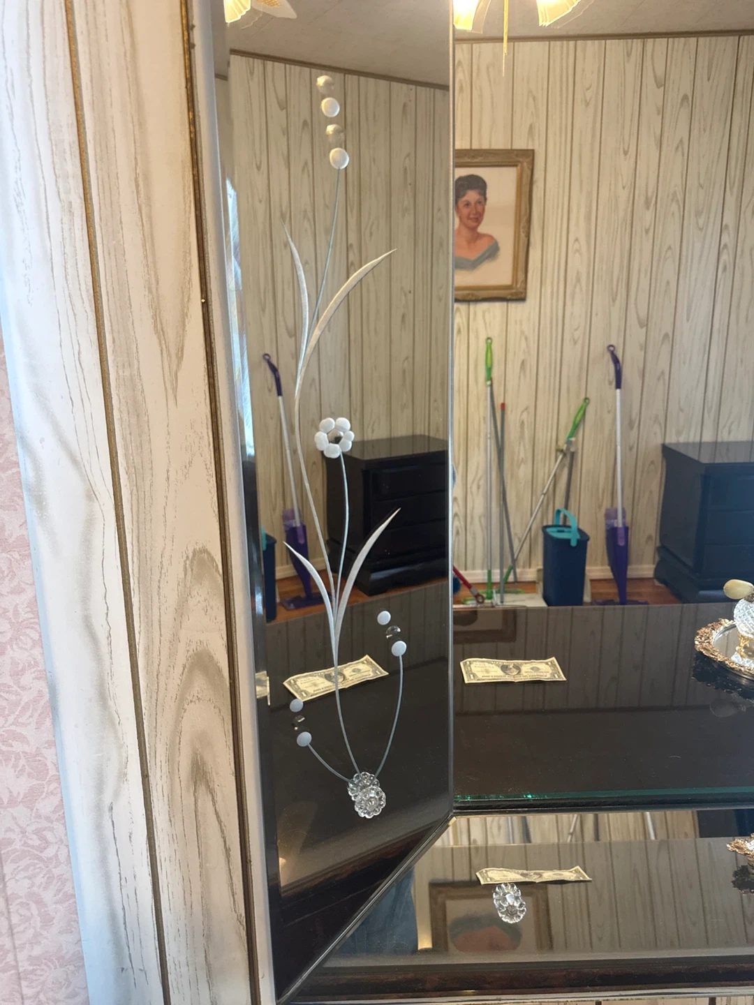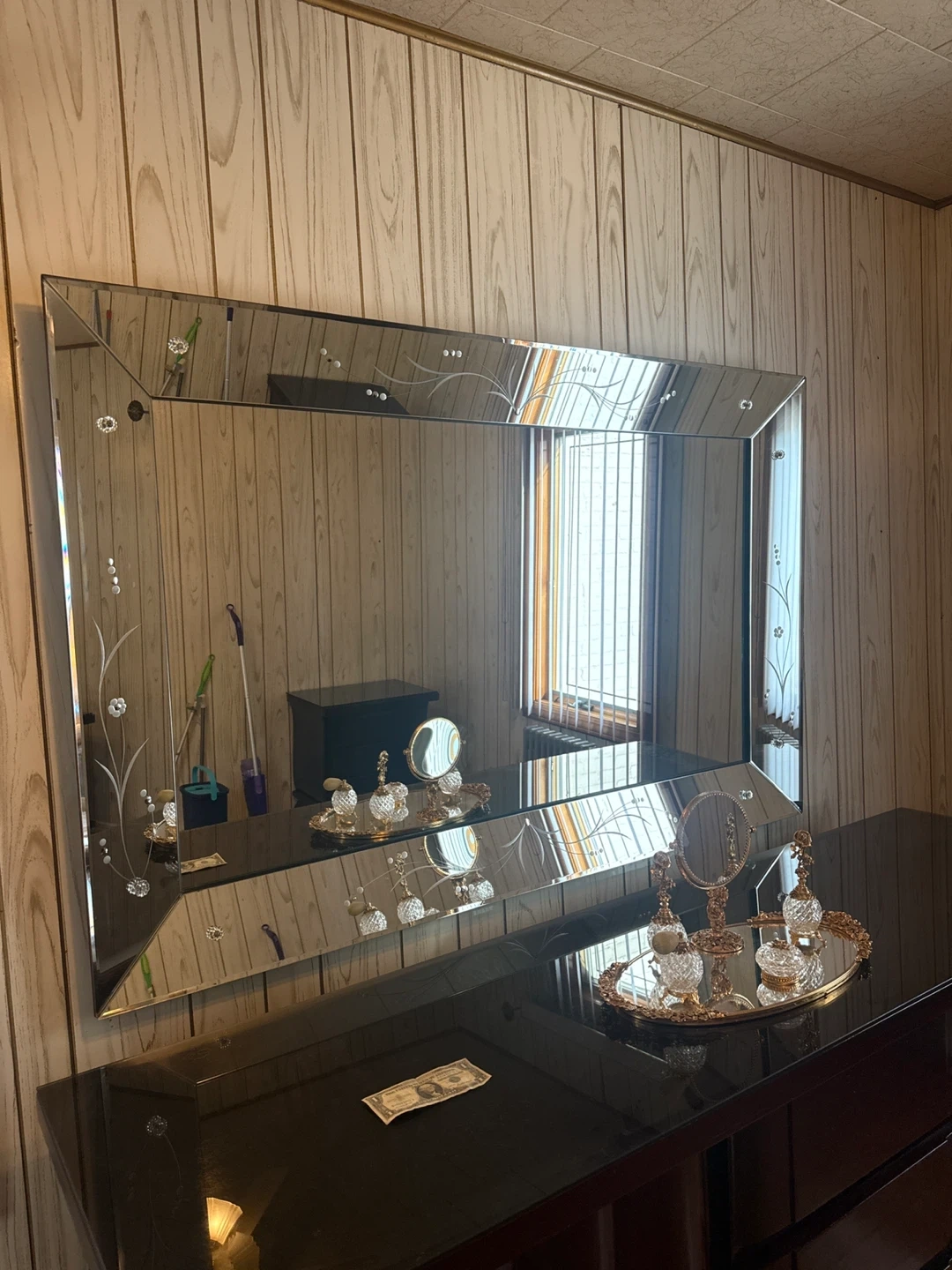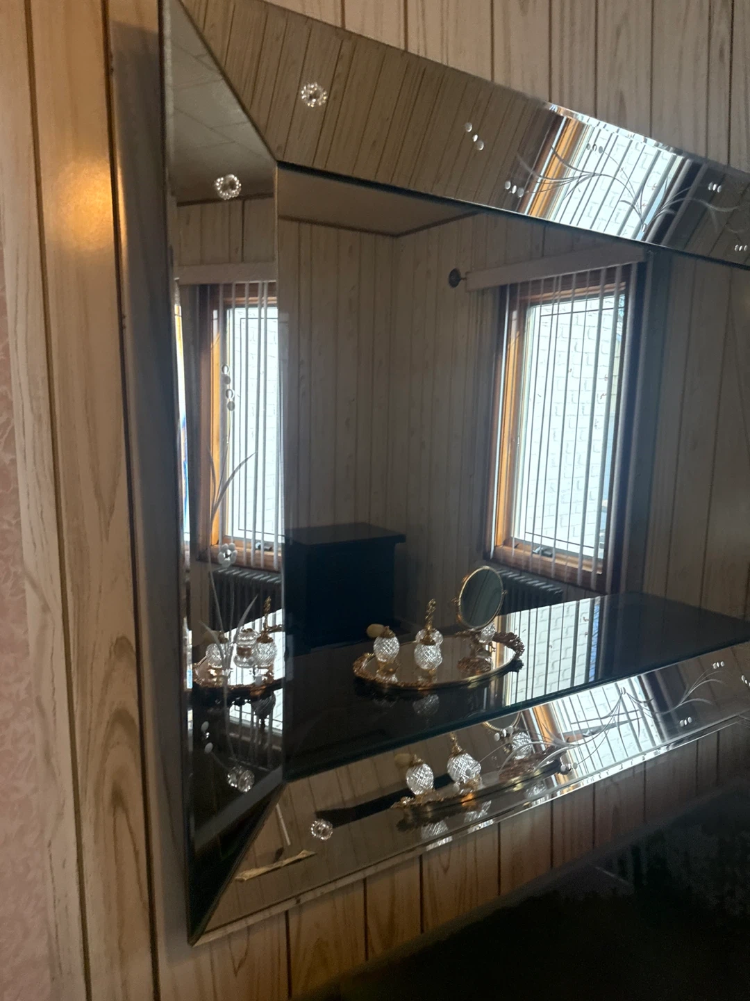 Add a touch of sparkle to your space with this eye-catching beveled mirror! The rhinestone accents catch the light beautifully, making it a stunning focal point for any room. It's in great condition and ready to bring a touch of glam to your home