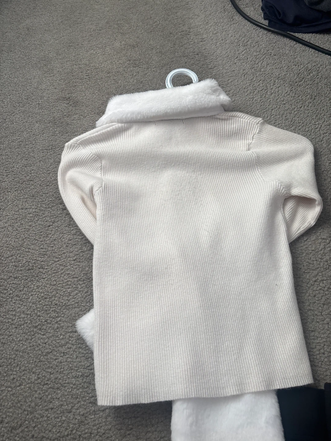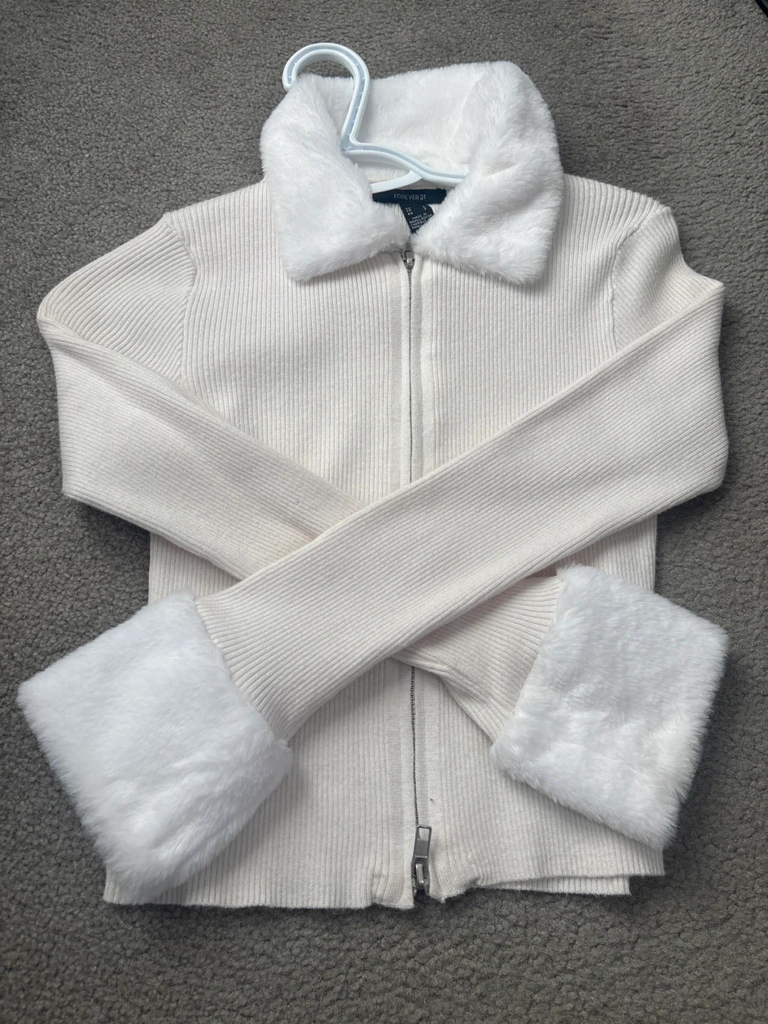 Selling a cute Forever 21 cardigan with faux fur trim! It's a cream/off-white colour and features fur on the collar and cuffs. Perfect for adding a touch of cozy to any outfit