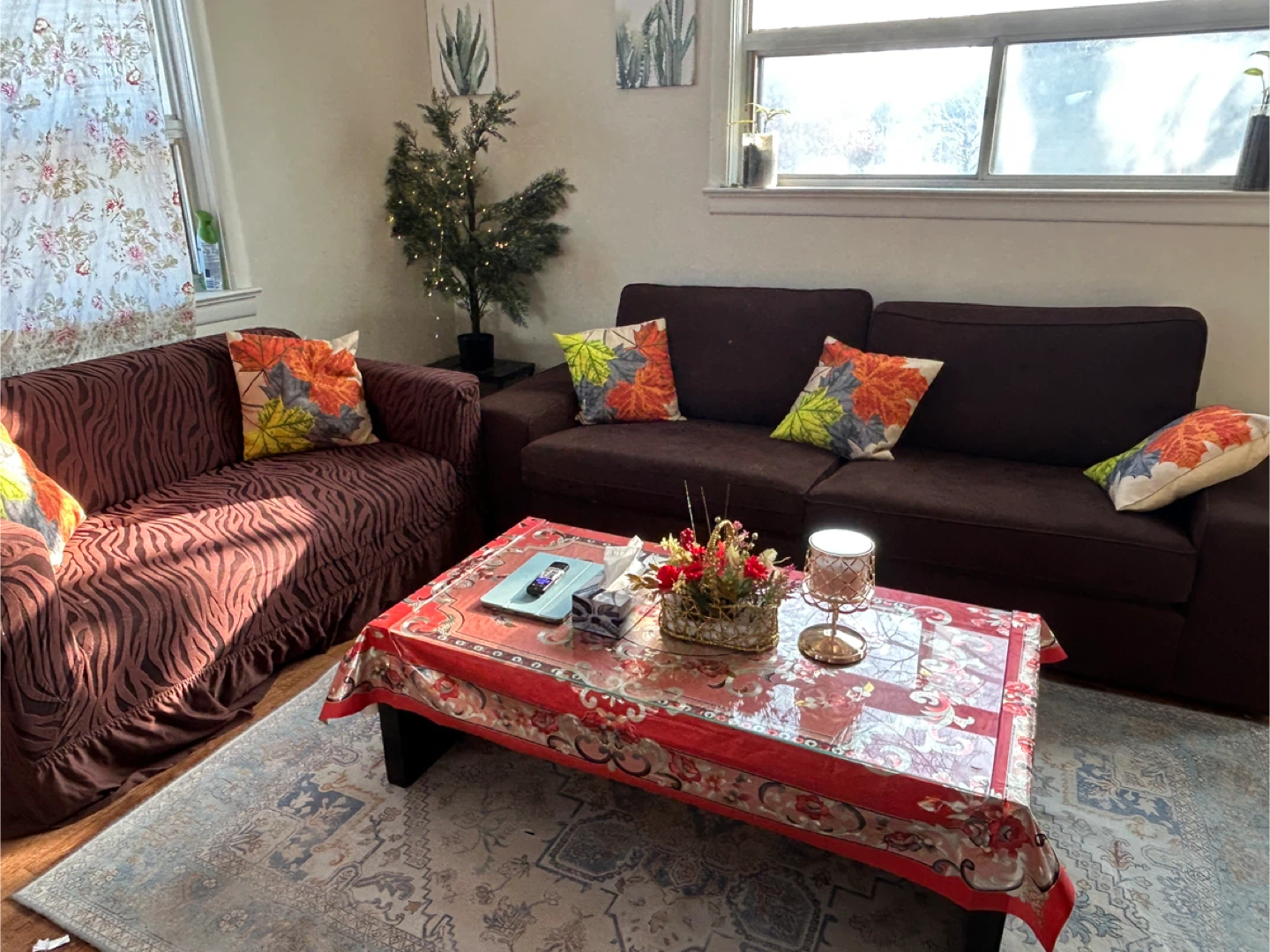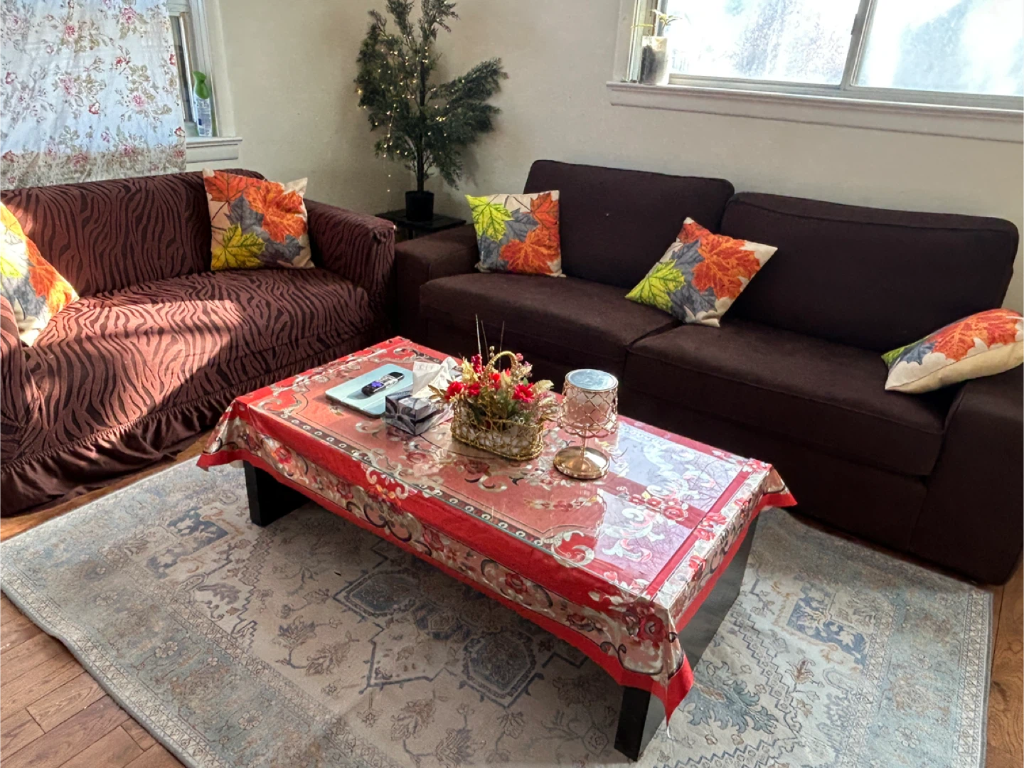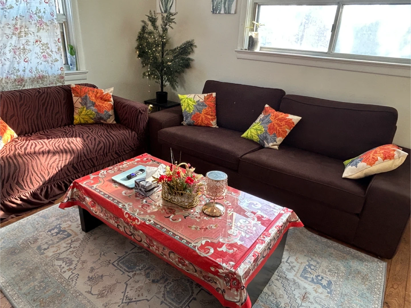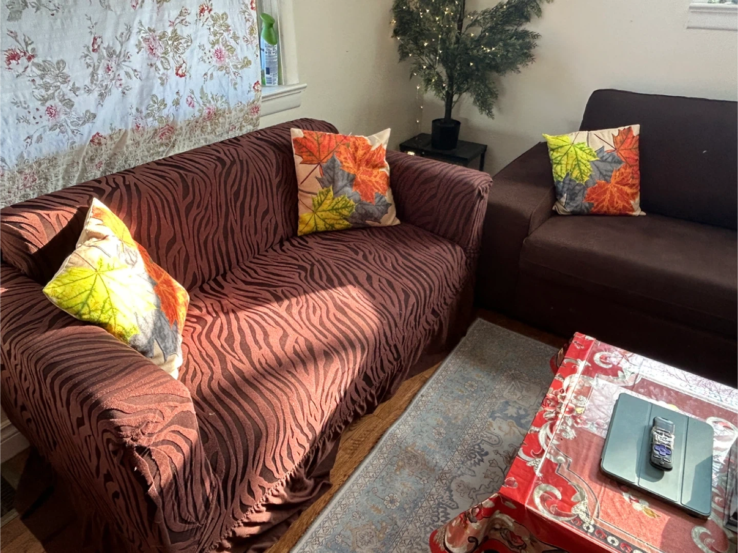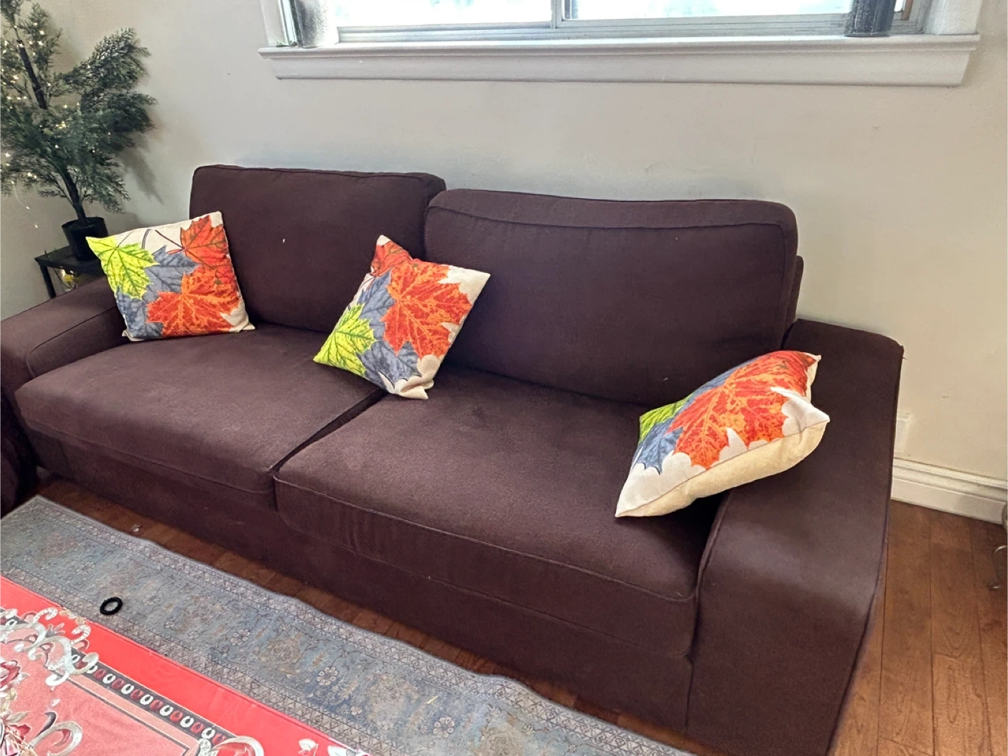 Selling a comfy brown sofa and loveseat set. It's in great condition and ready for a new living room! The set includes a sofa and a loveseat, perfect for lounging and relaxing and coffee table