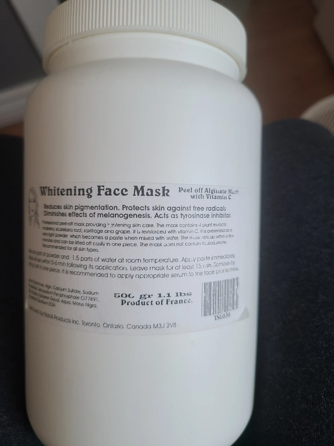 Selling a Natali Products Whitening Face Mask. This peel-off alginate mask helps reduce skin pigmentation and protects against free radicals. It diminishes the effects of melanogenesis and acts as a tyrosinase inhibitor. It contains plant extracts like mulberry, sculellaria root, and saxifrage, reinforced with vitamin C. Mix one part powder with 1.5 parts water at room temperature, apply immediately, and leave on for at least 15 minutes. The mask is 500 gr / 1.1 lbs and is a product of France