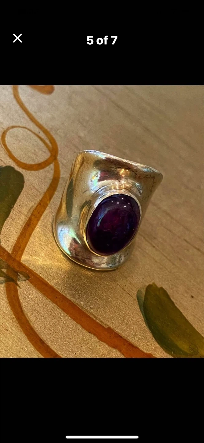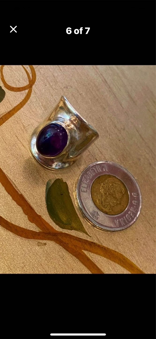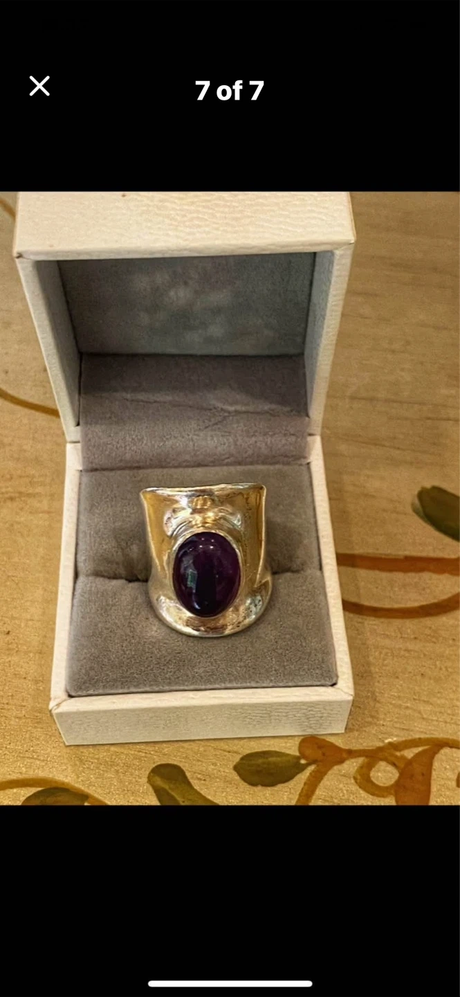 💜Selling a stunning Sterling silver ring featuring a striking cabochon amethyst !💜 It's in great condition and comes in a box for safekeeping. The ring has an oval-shaped stone and a textured silver band. It weighs approximately 14.9 grams.💜