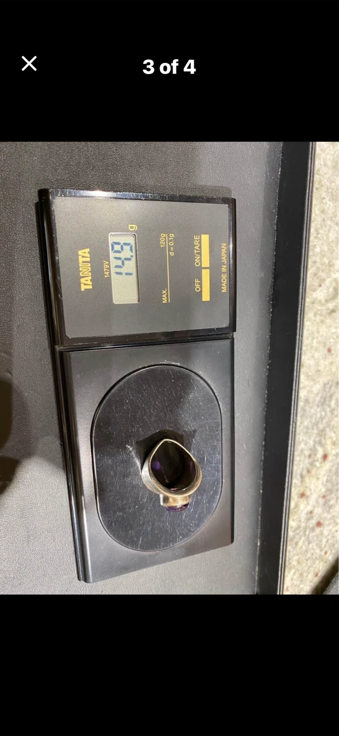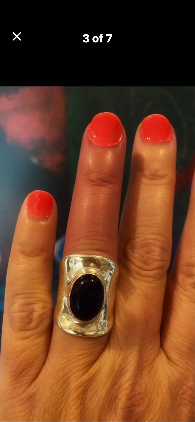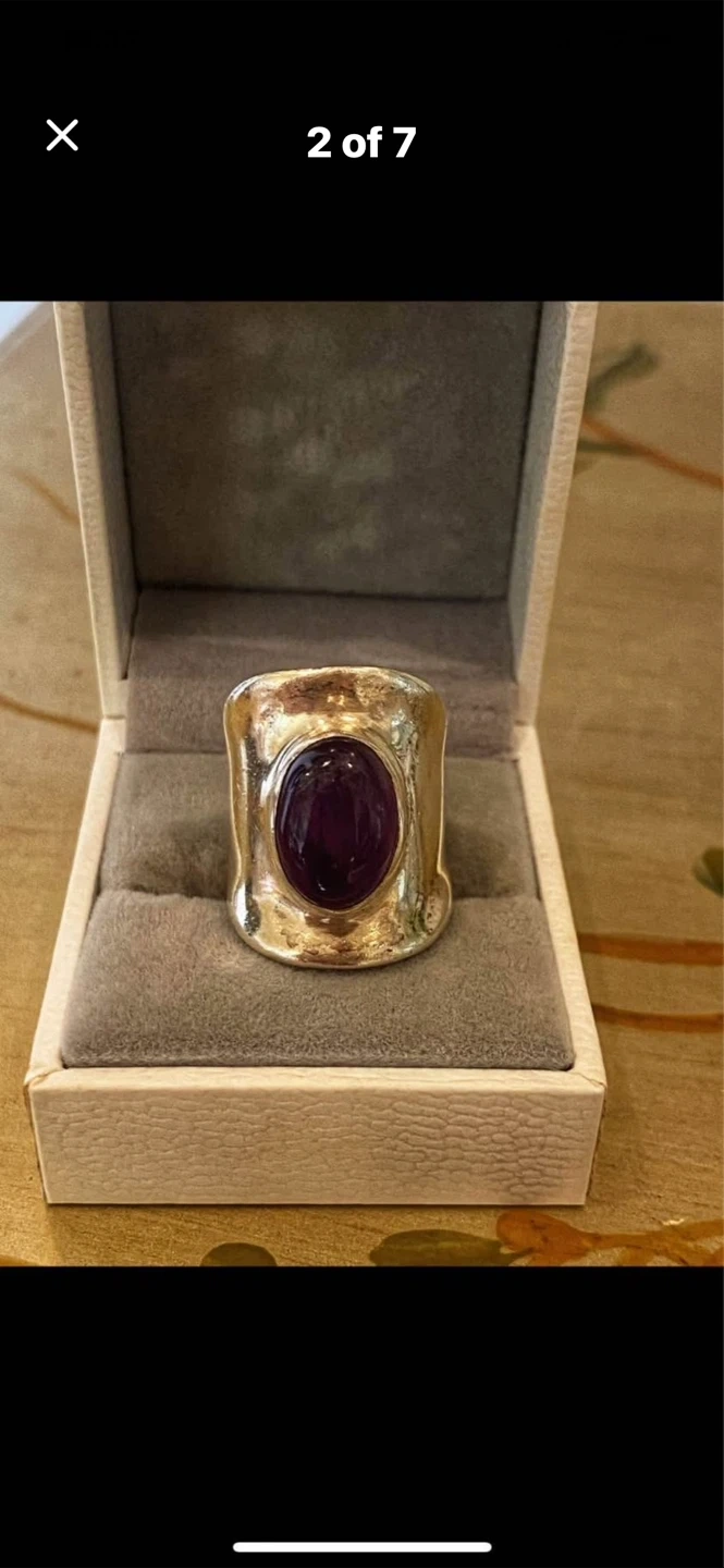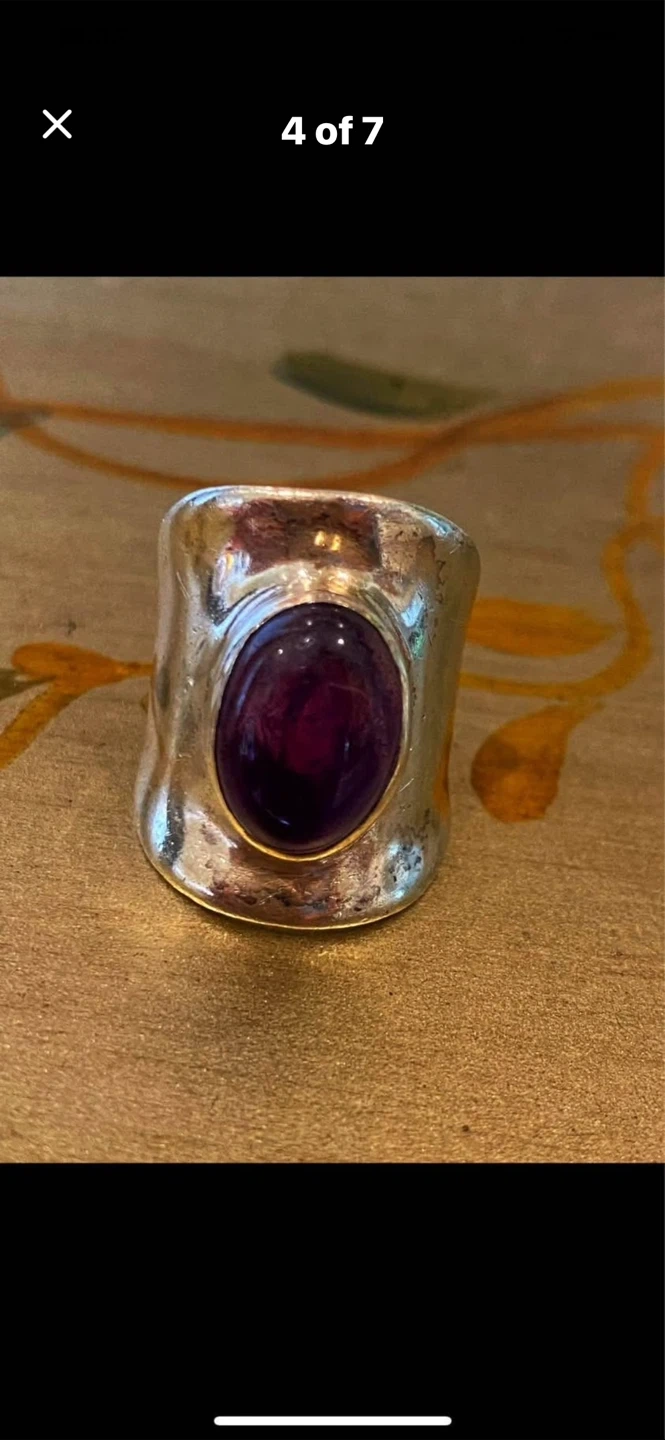 💜Selling a stunning Sterling silver ring featuring a striking cabochon amethyst !💜 It's in great condition and comes in a box for safekeeping. The ring has an oval-shaped stone and a textured silver band. It weighs approximately 14.9 grams.💜