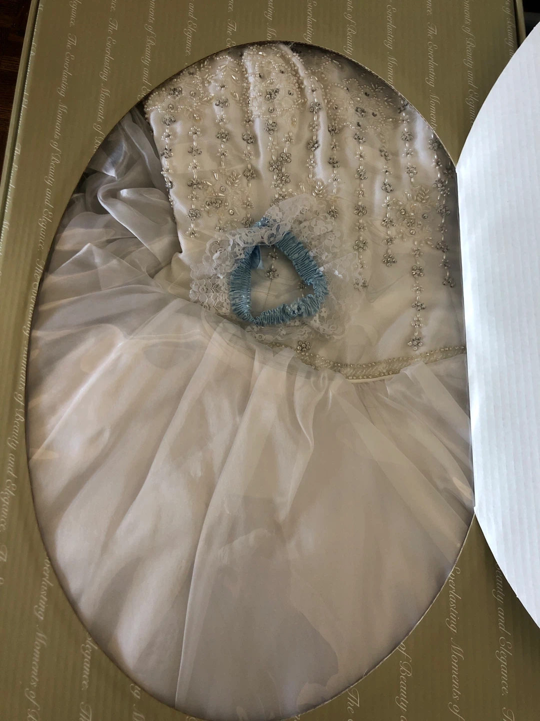 Selling a beautiful Champagne wedding dress, complete with its original box. The dress is white and features delicate embellishments. It's in great condition and ready for its next special day!