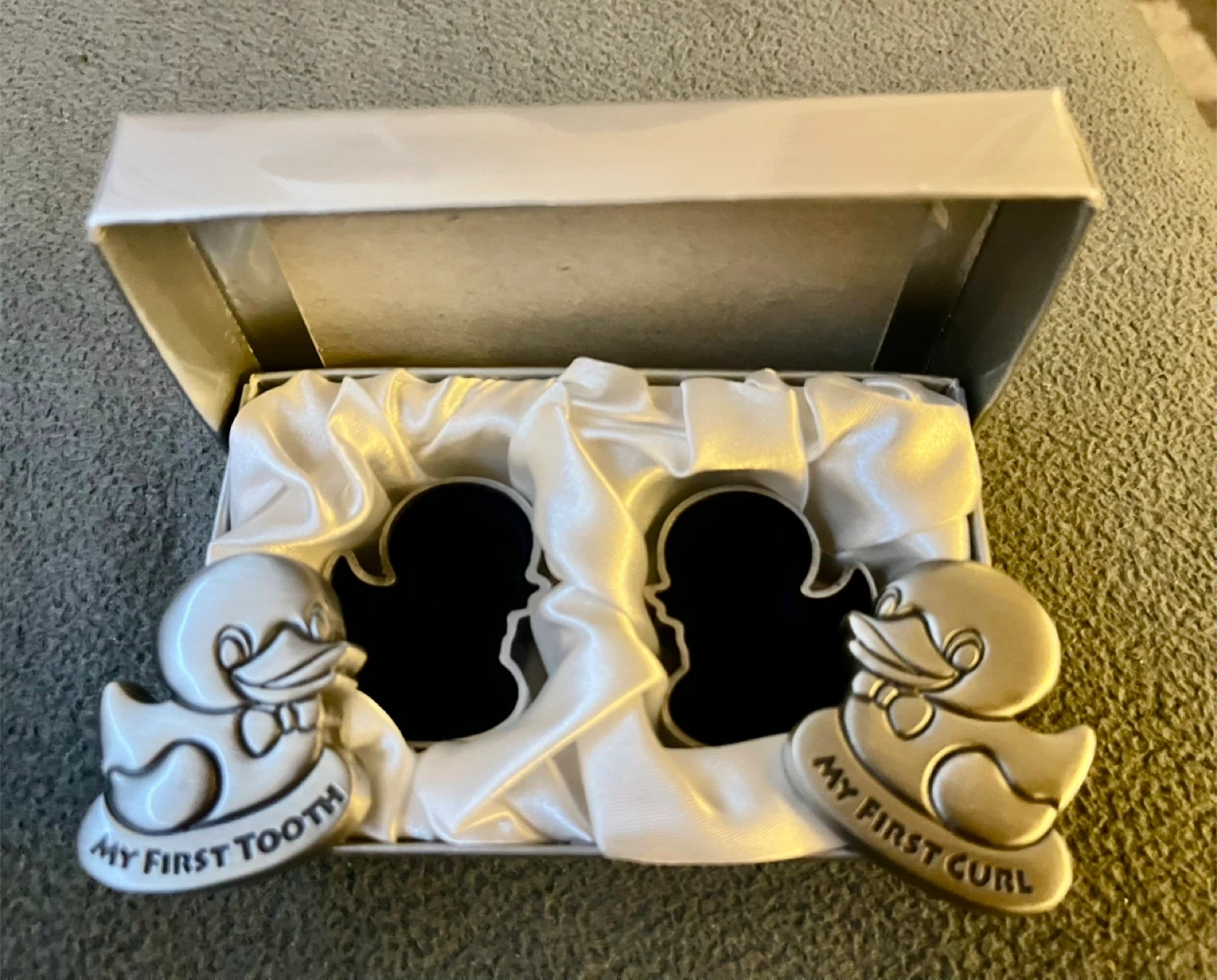 Brand new keepsake box for baby's first tooth and curl! The box is included, with satin lining cradling the two duck-shaped containers. Each container is labelled 'My First Tooth' and 'My First Curl'