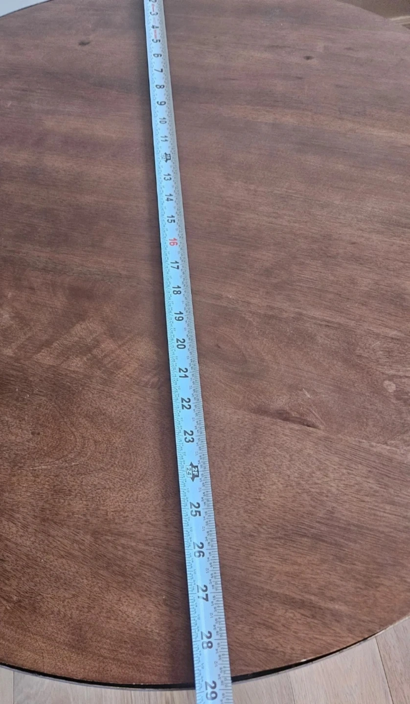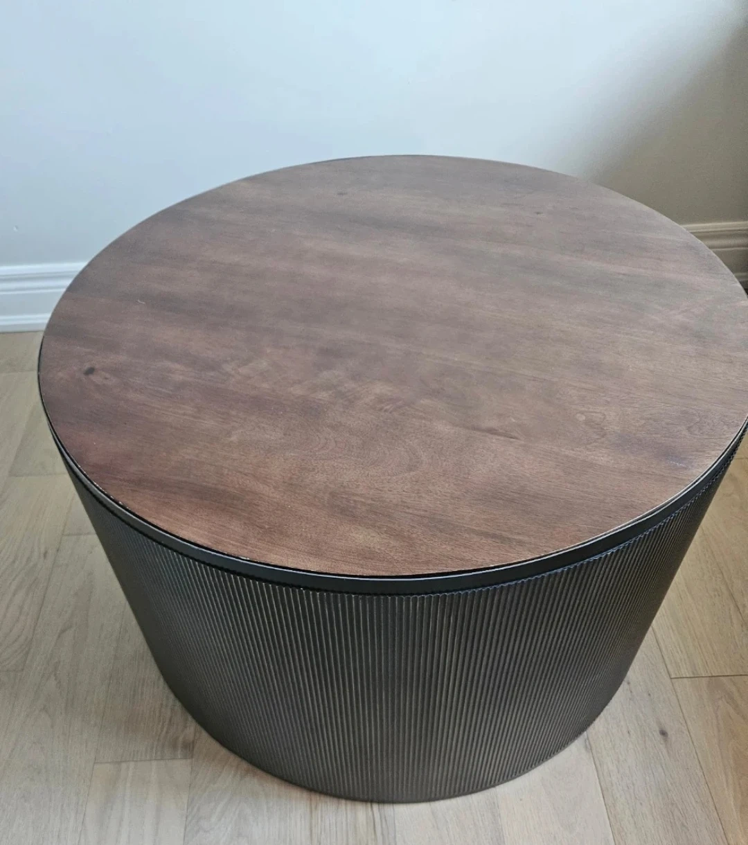 Here's a stylish round coffee table that would look great in any living room! It features a dark brown wood top and a base with a unique ribbed design. It measures approximately 18 inches tall and 29 inches in diameter.