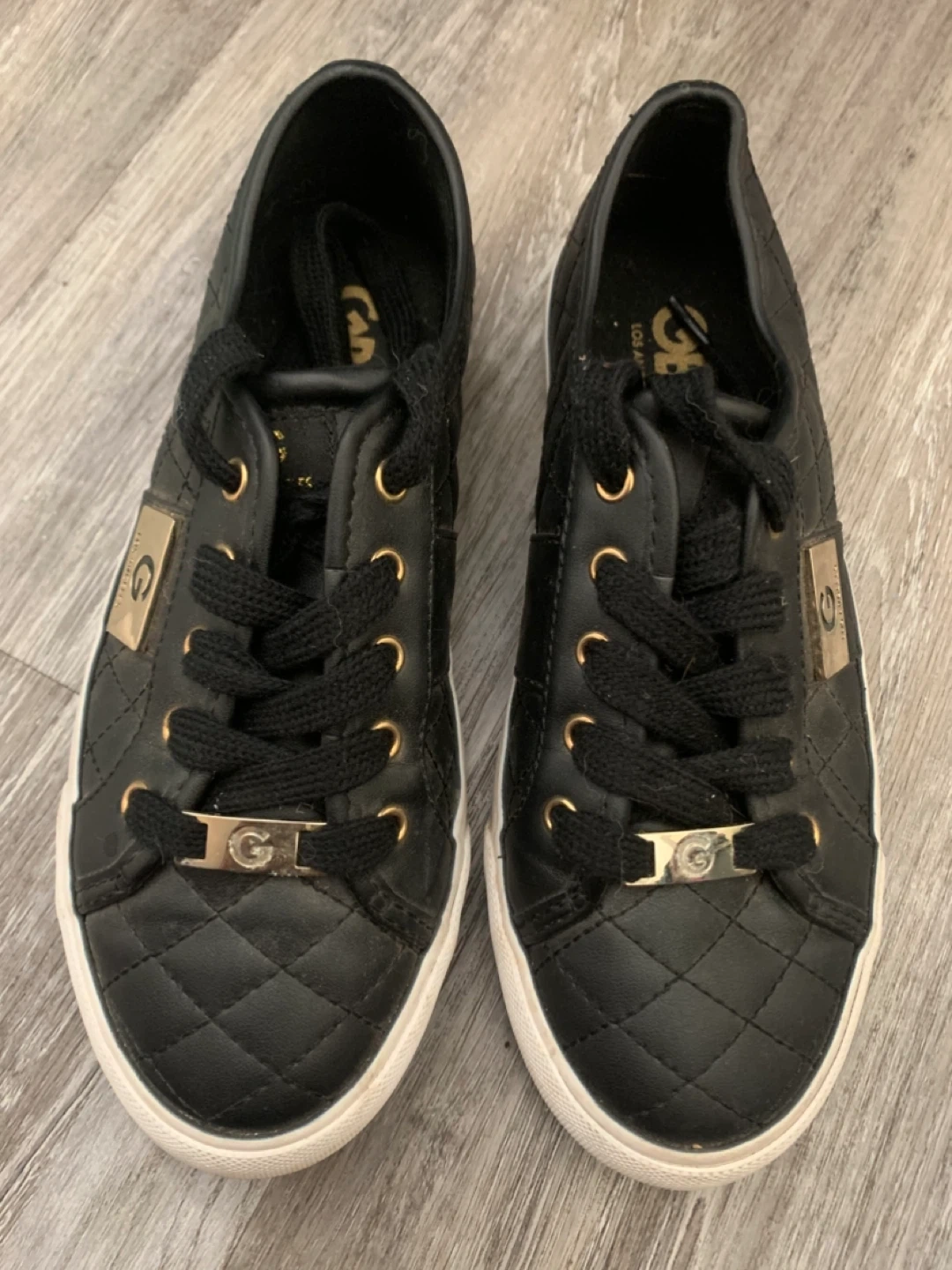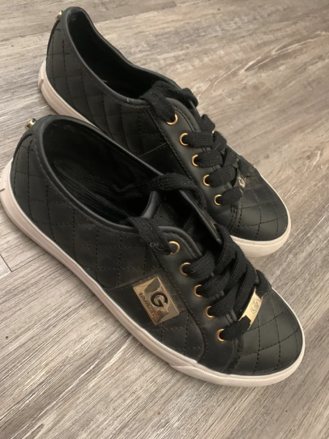 These Guess sneakers are a stylish addition to any casual outfit! They feature a quilted design and the Guess logo on the side. The shoes are black with gold accents and are in perfect condition. Size 6.