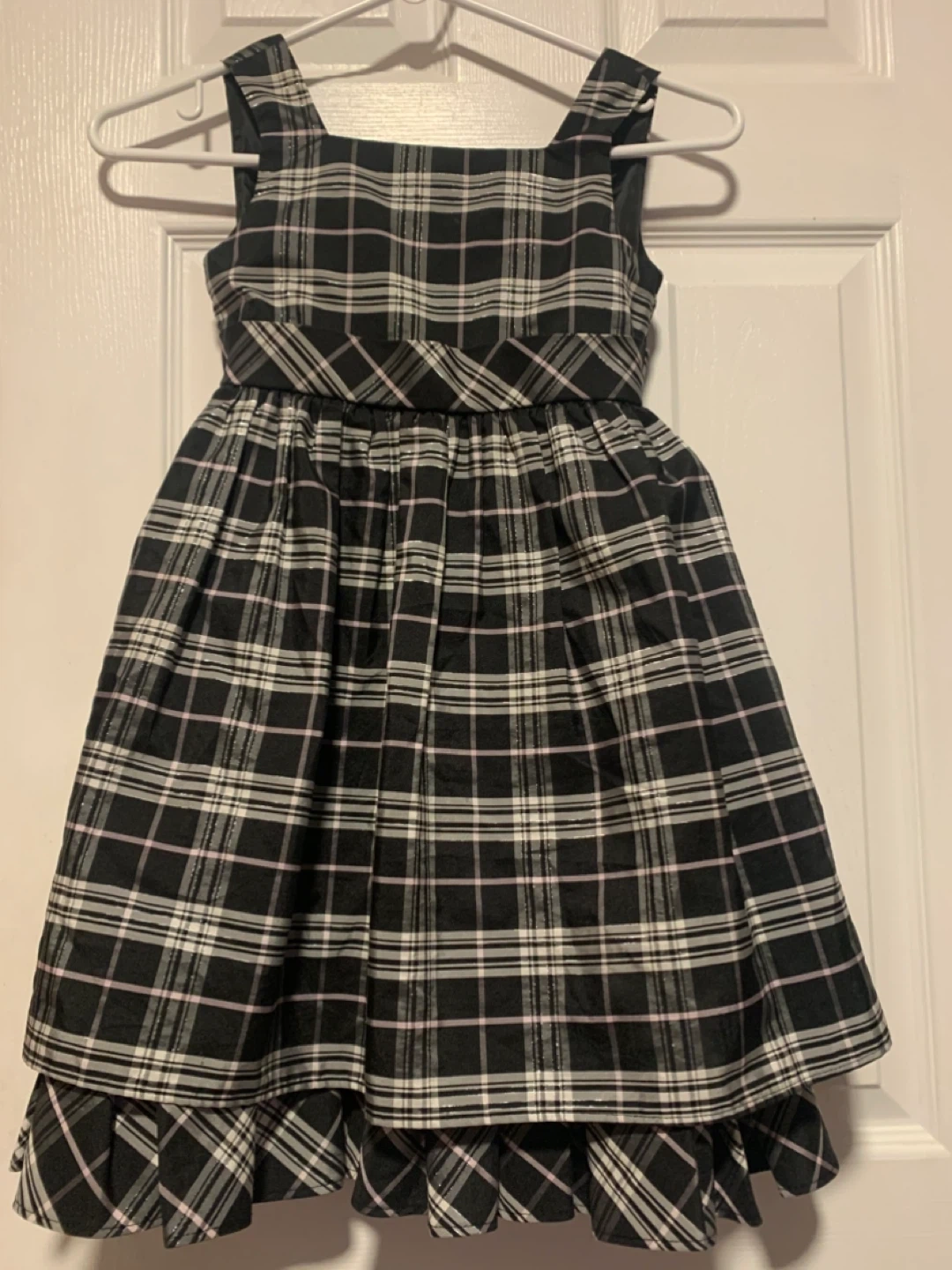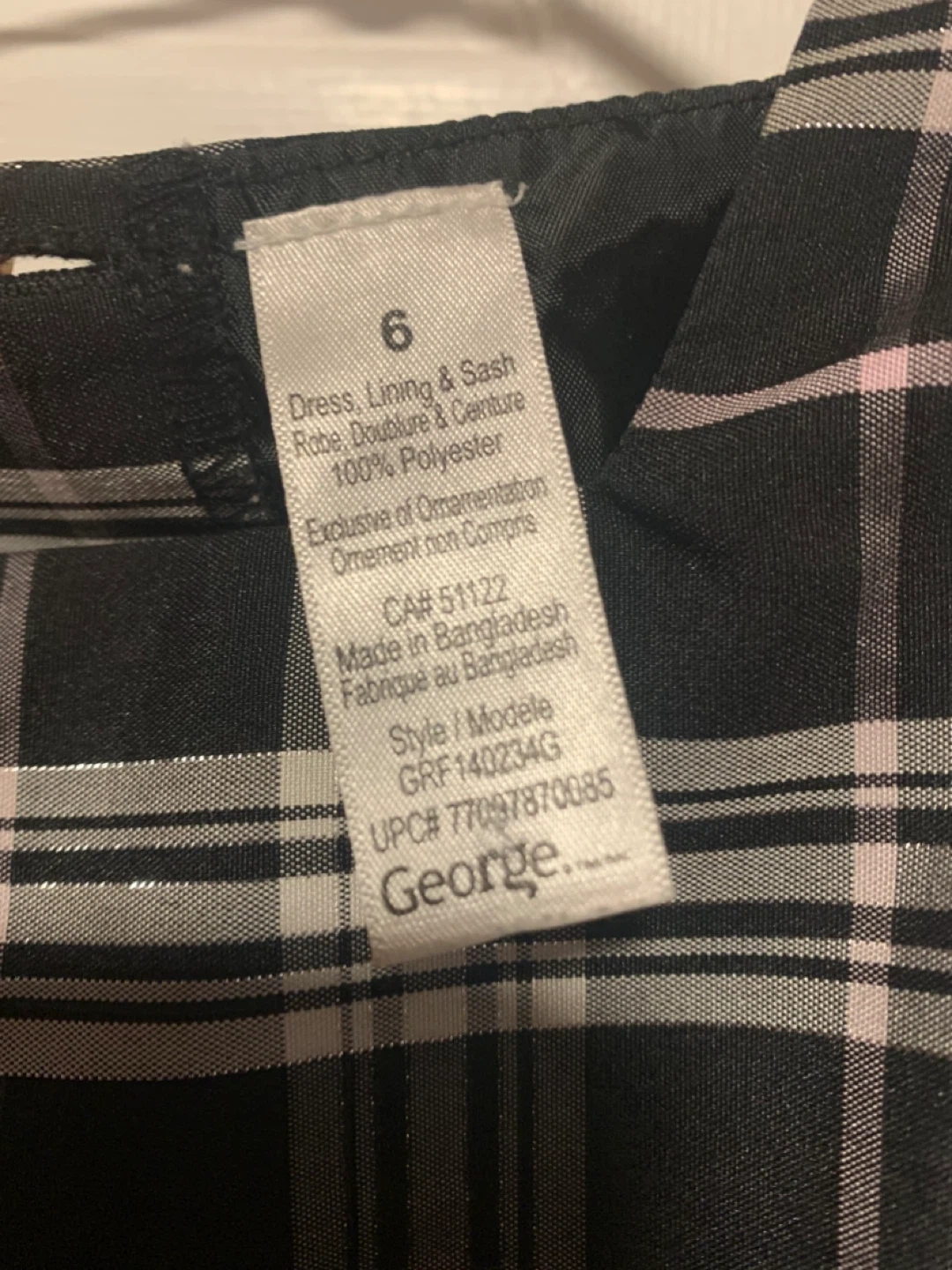 Selling a cute George brand dress for girls in size 6! The dress features a classic plaid pattern in black, white, and pink. It's made of 100% polyester, making it durable and easy to care for. Perfect for any occasion!