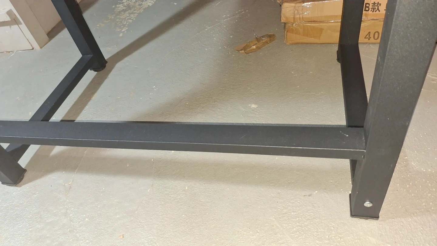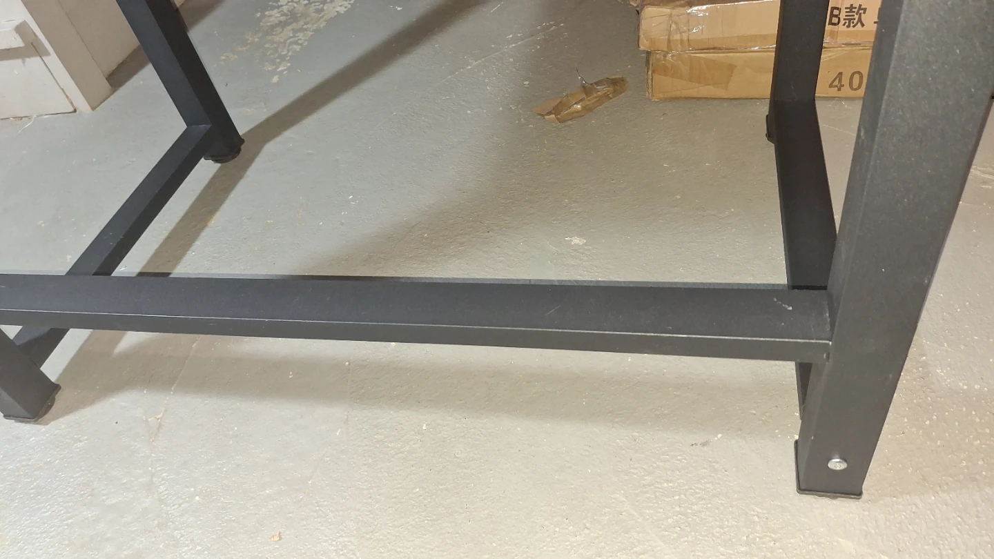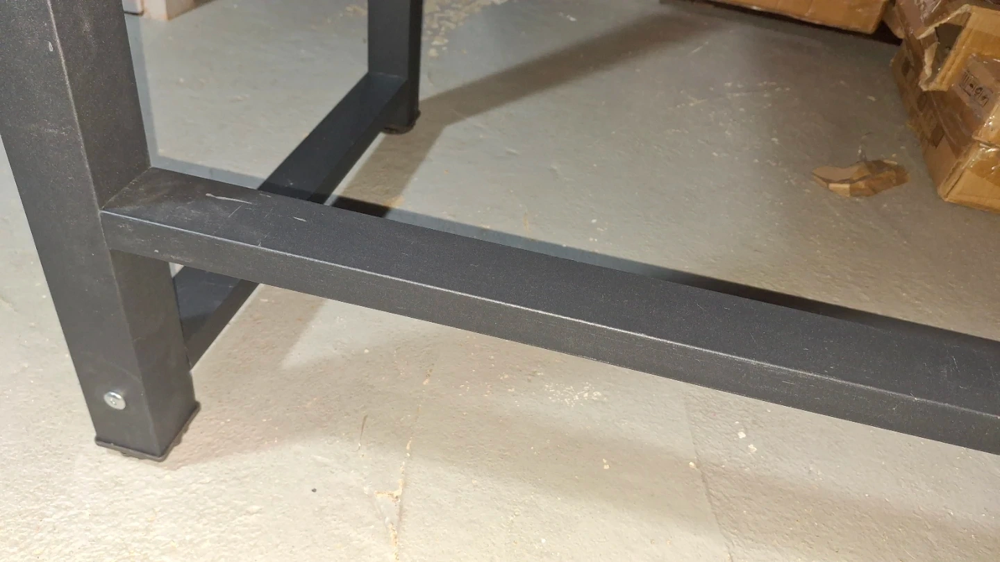 The legs are 5×5 cm steel with 5×2 cm cross‑bracing, so the desk stays completely stable with no wobble. The table legs have adjustment knobs so it can be perfectly balanced. The top is 2 cm thick, easy to clean, and securely mounted.