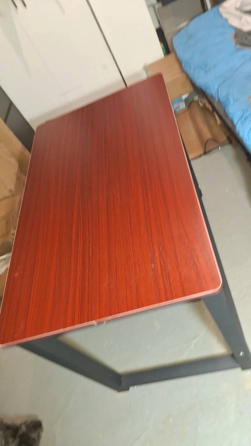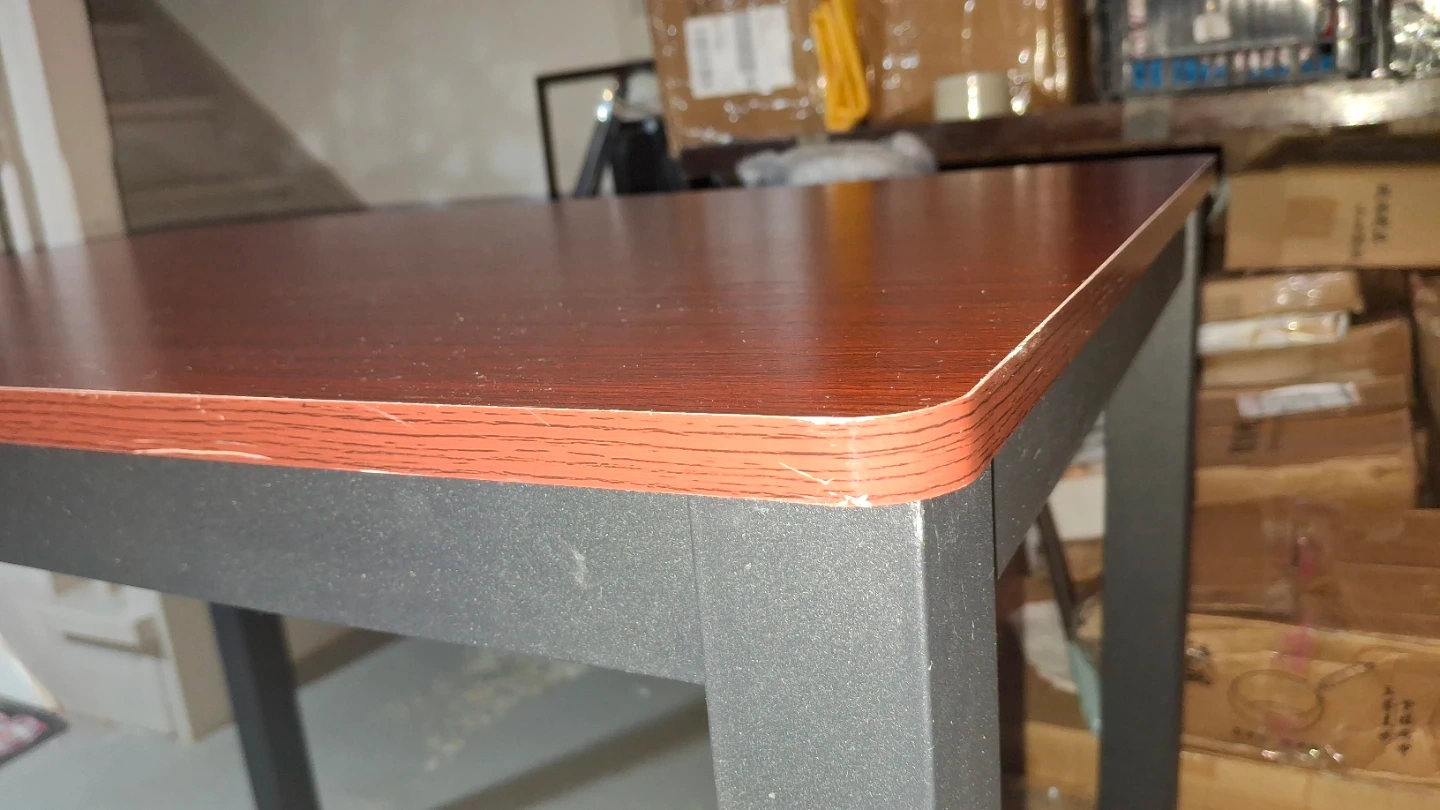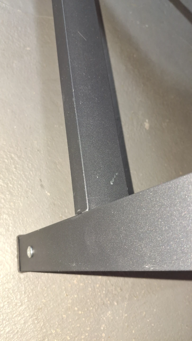 The legs are 5×5 cm steel with 5×2 cm cross‑bracing, so the desk stays completely stable with no wobble. The table legs have adjustment knobs so it can be perfectly balanced. The top is 2 cm thick, easy to clean, and securely mounted.