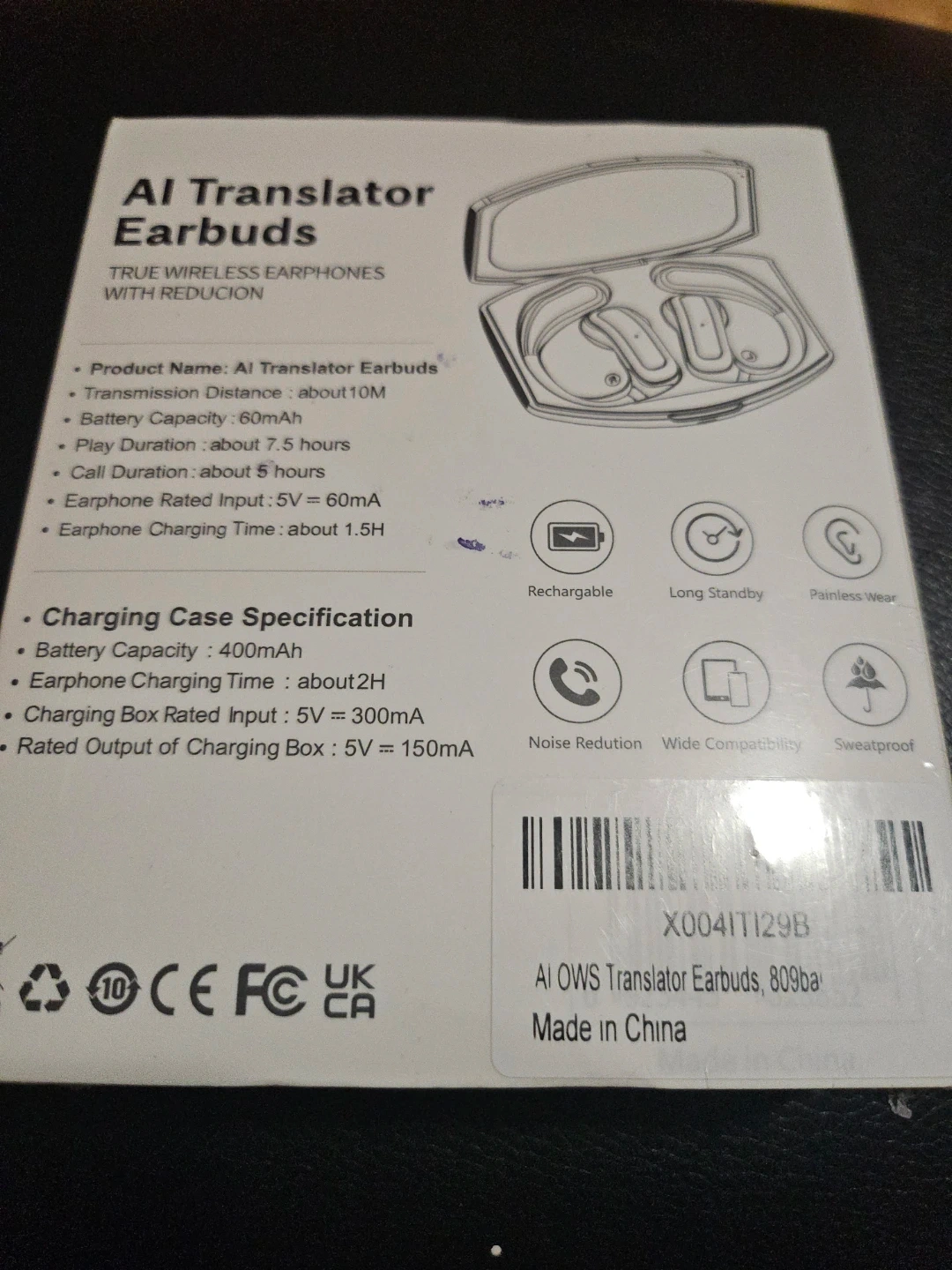 Selling a brand new pair of AI Translator Earbuds! These are true wireless earphones with noise reduction. The box includes the charging case, which has a battery capacity of 400mAh, and the earphones themselves charge in about 2 hours. The earphones have wide compatibility and are sweatproof. Get ready for painless wear and long standby time!