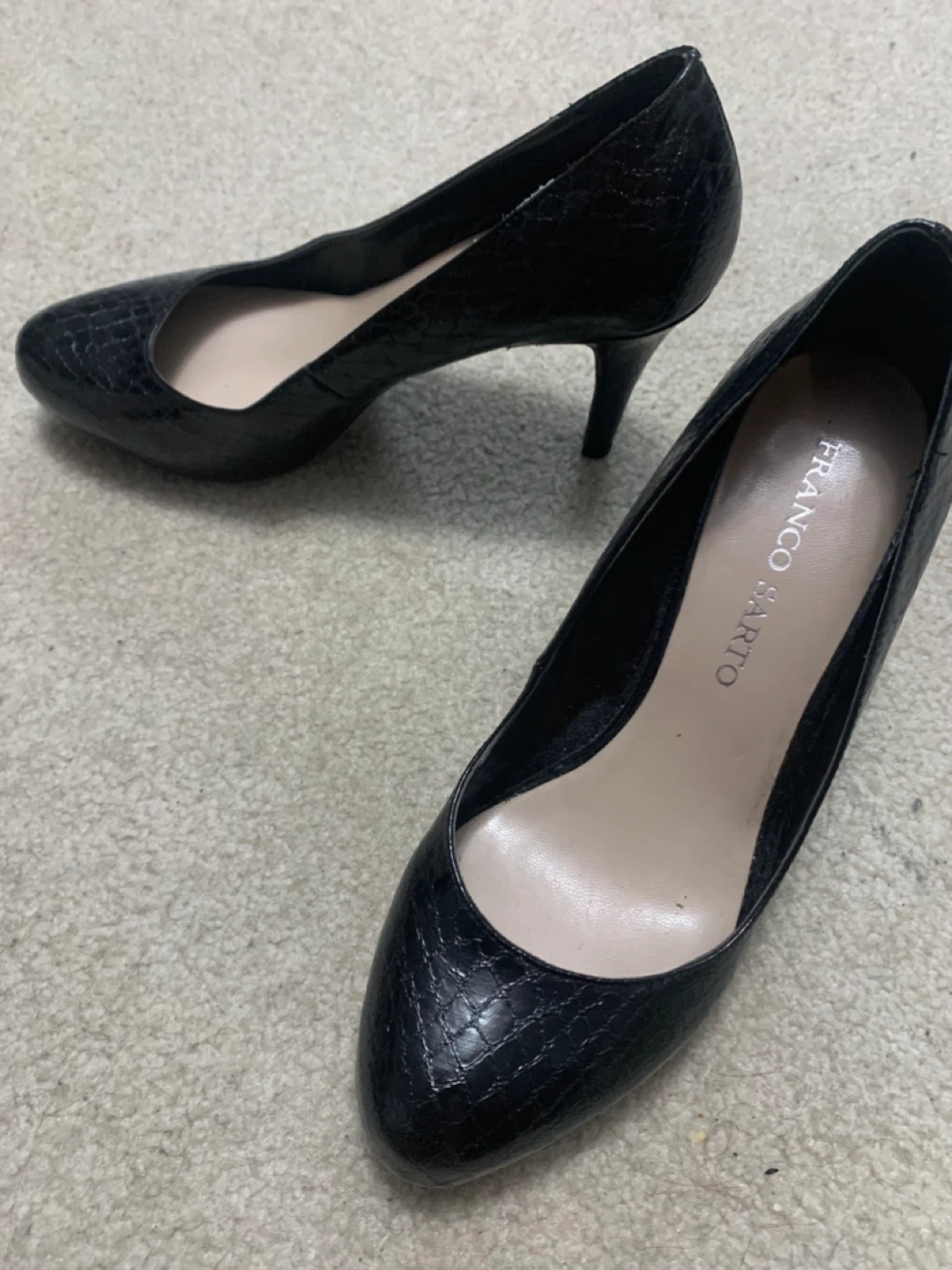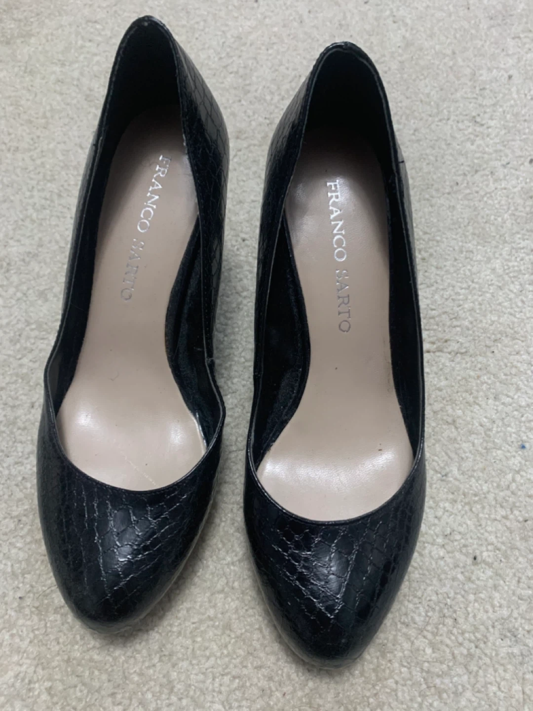 These are a pair of Franco Sarto black heels. They have a snakeskin-like texture and are in good condition. Comfy and stylish!