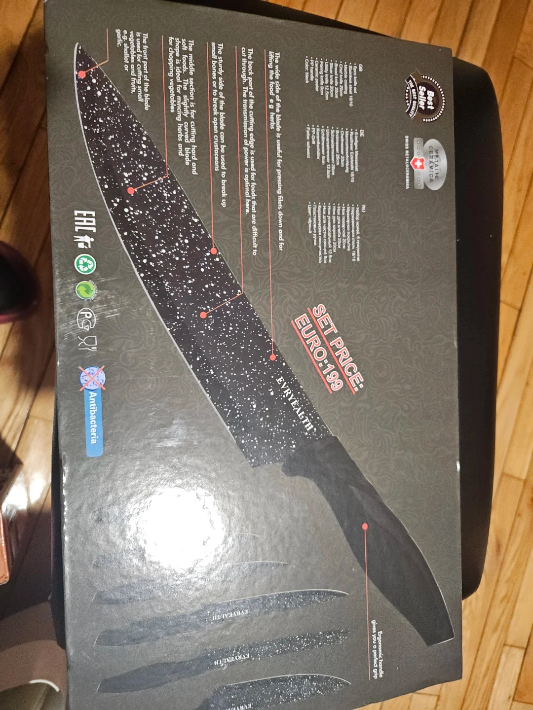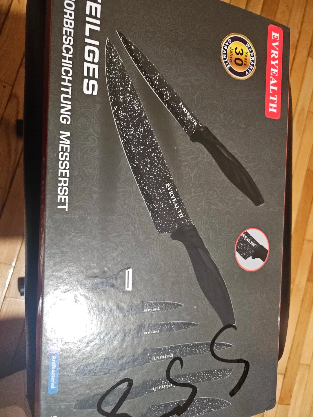 Selling a brand new EVRYEALTH knife set, still in its original box! This set includes various knives with antibacterial coating, perfect for all your cutting needs. The blades are designed for cutting meat, vegetables, and more. A great addition to any kitchen!
