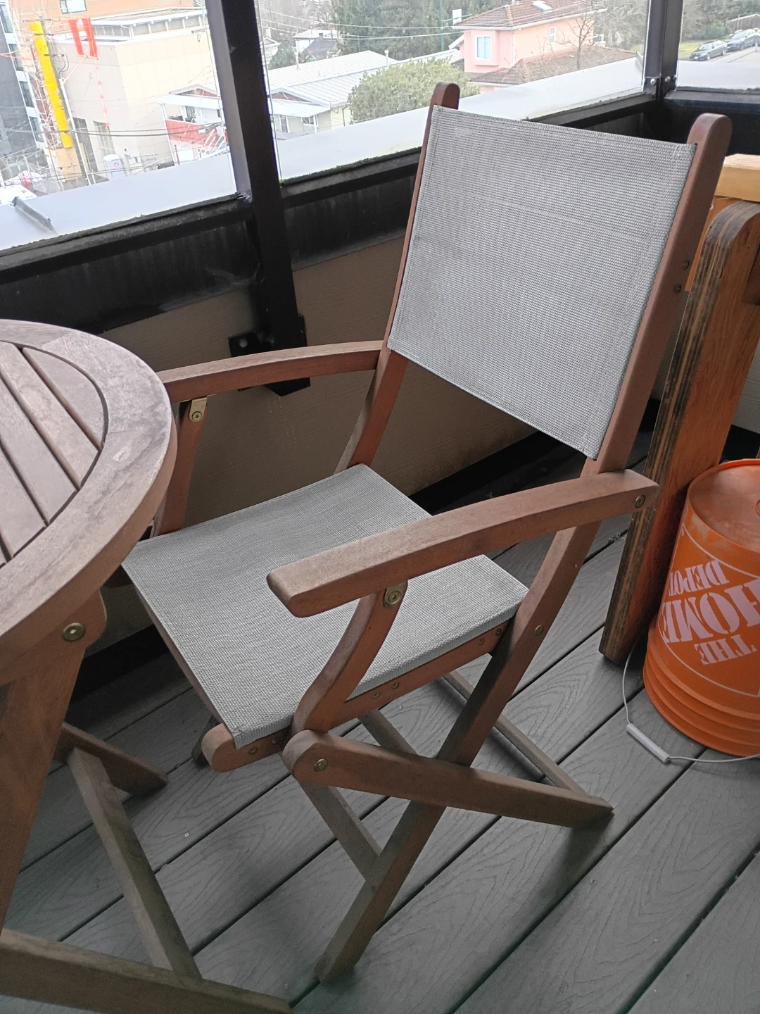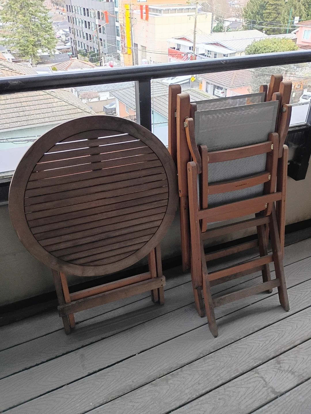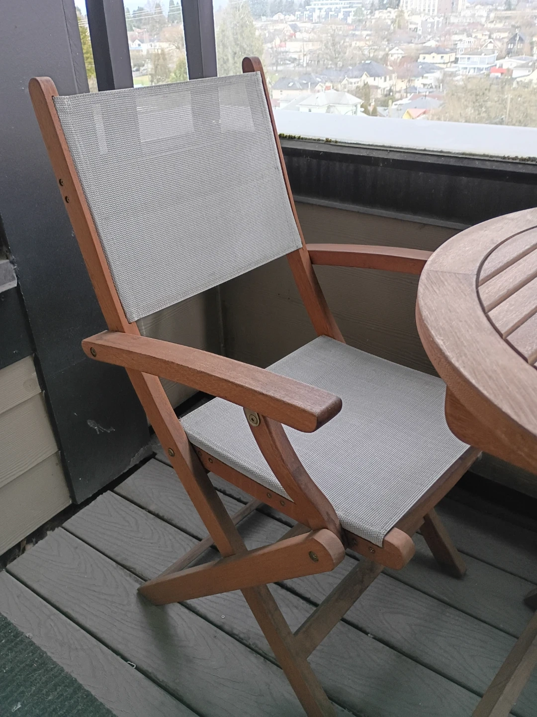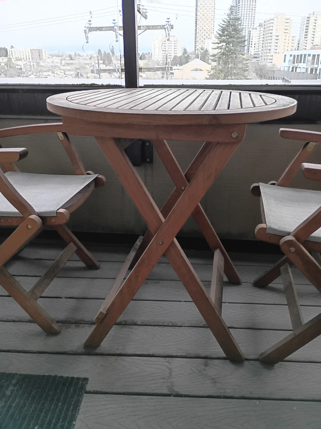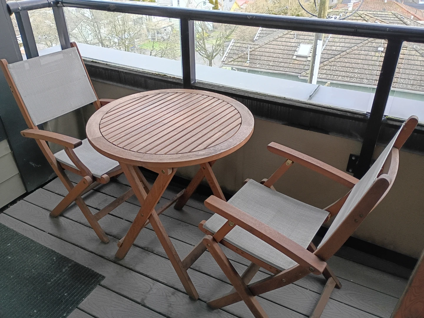 Selling a 3 piece wooden patio set, perfect for a small balcony or deck! It includes a 28" round wooden table and two matching folding chairs with light grey canvas seats and backs. The set is in great condition but could use a good cleaning. Folds up easily for storage during the colder months.