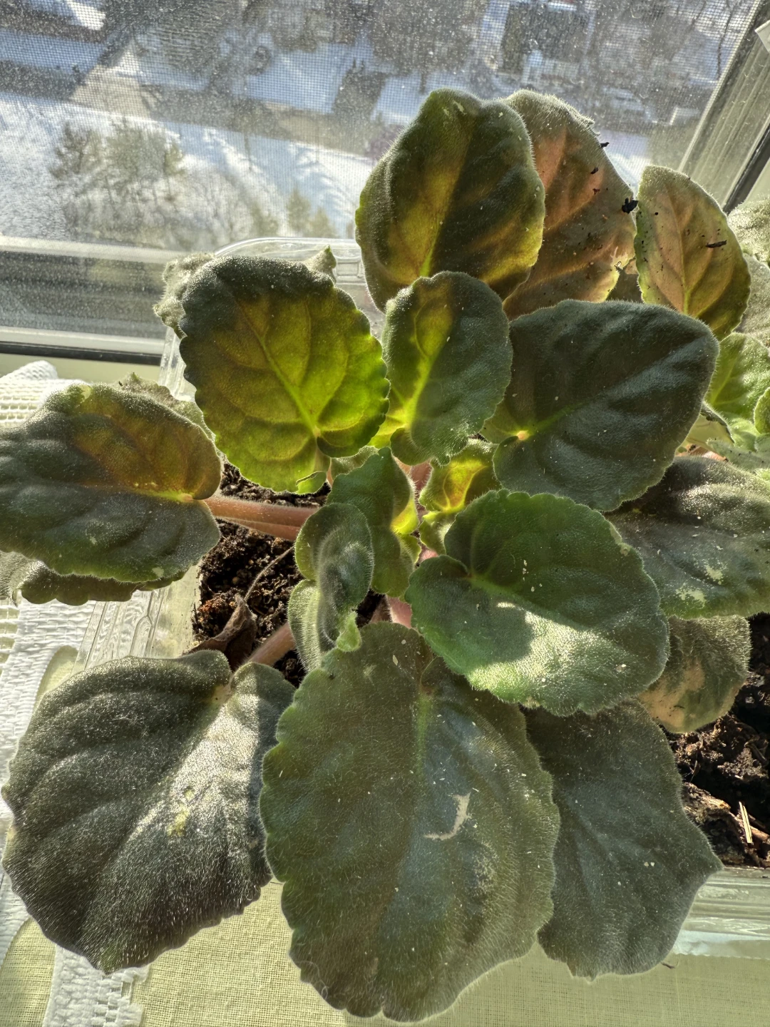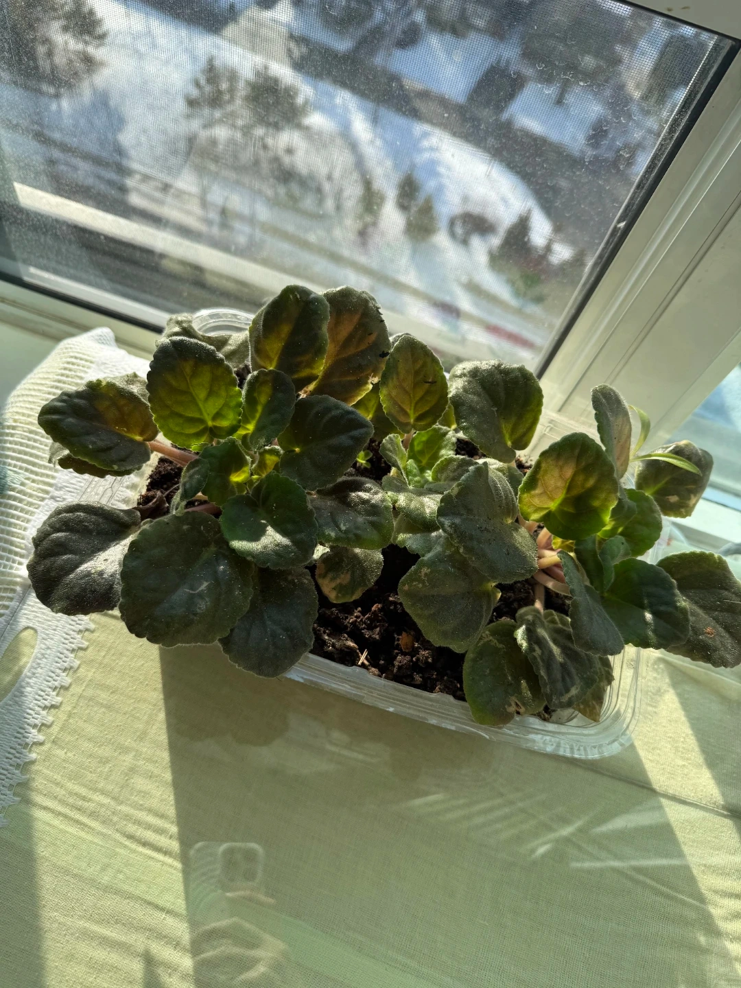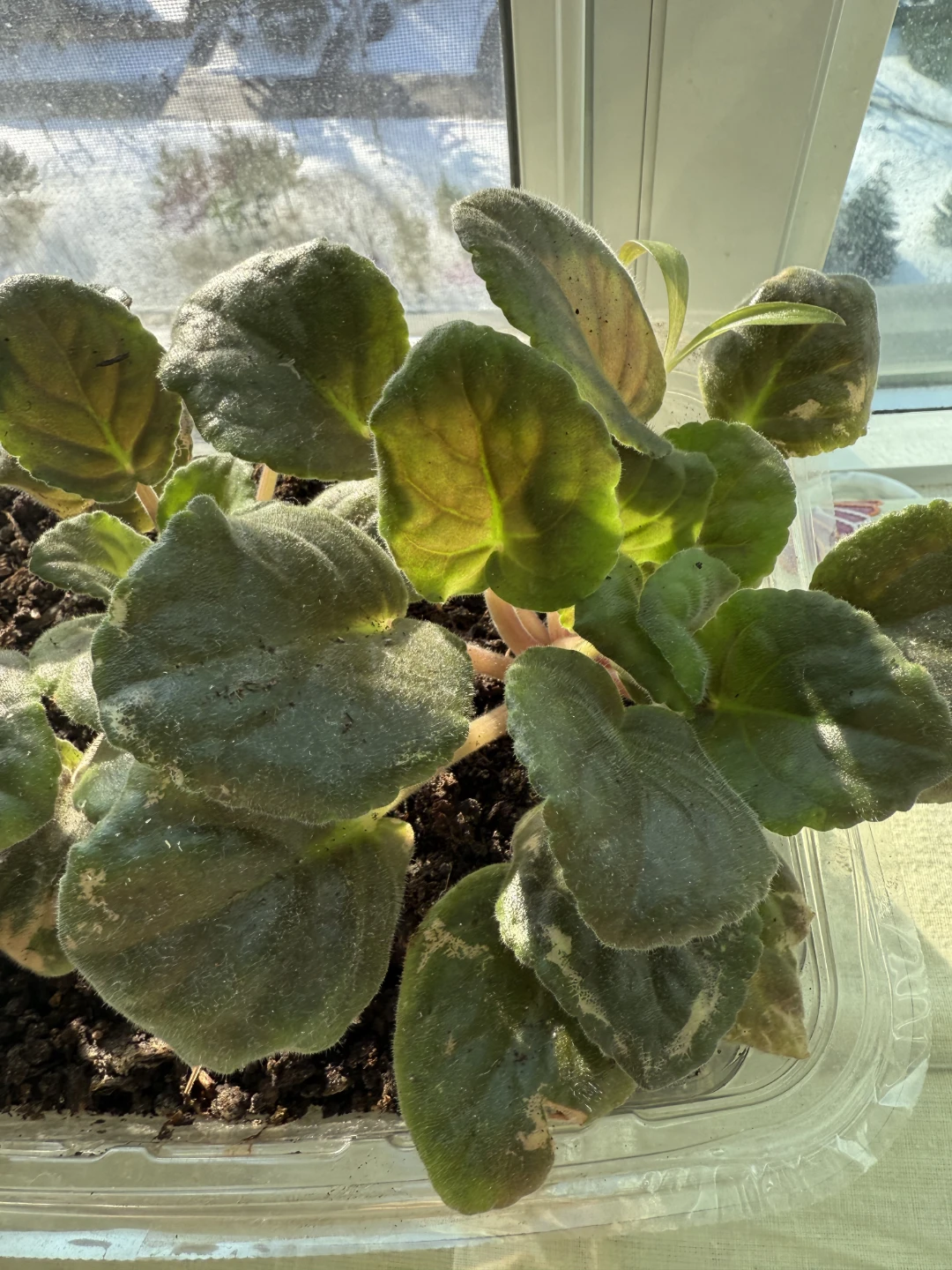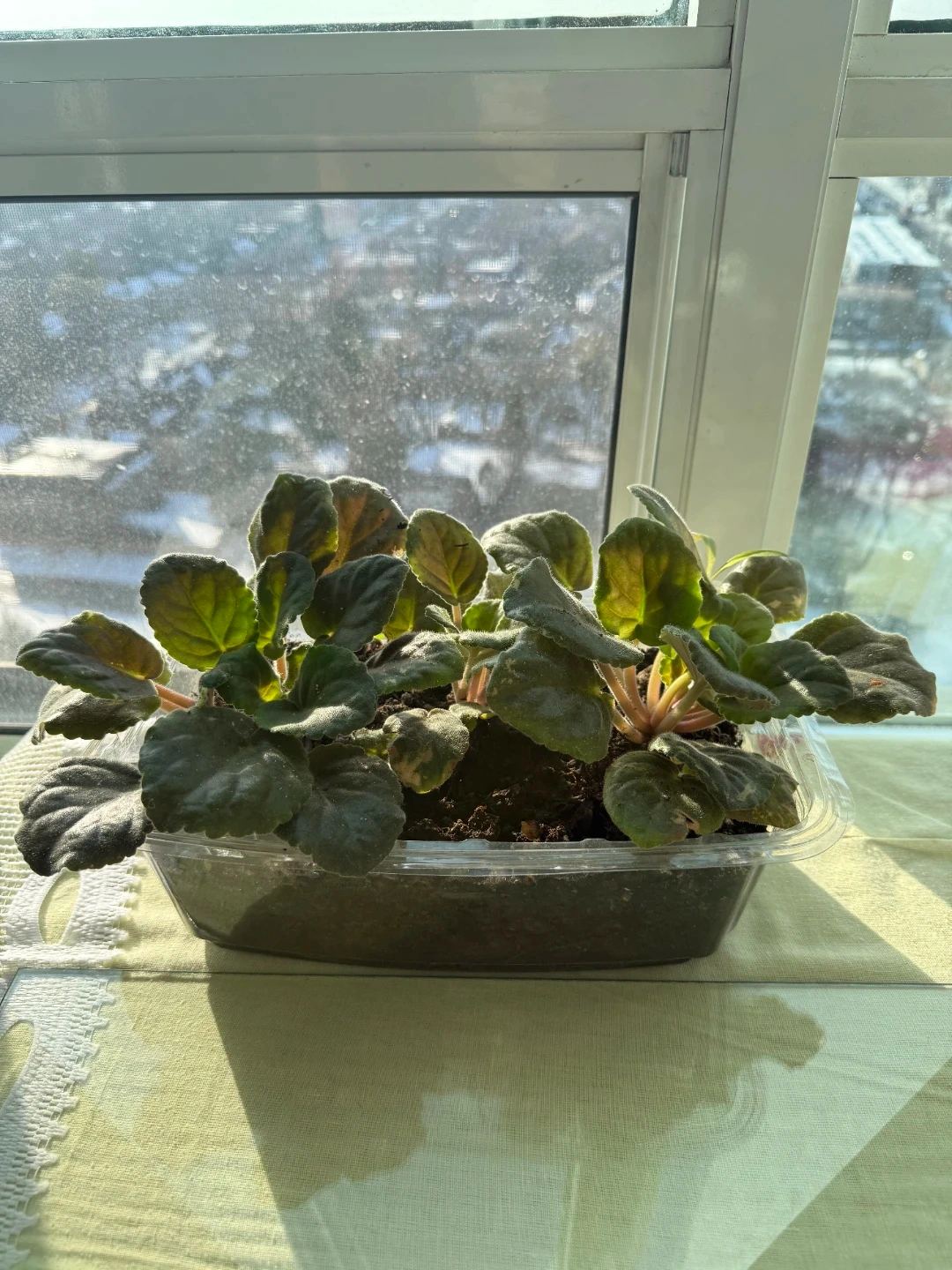 Selling a healthy African Violet plant! It's currently in a clear plastic container with soil. The leaves are a beautiful mix of green and purple hues. Perfect for adding a touch of nature to your home