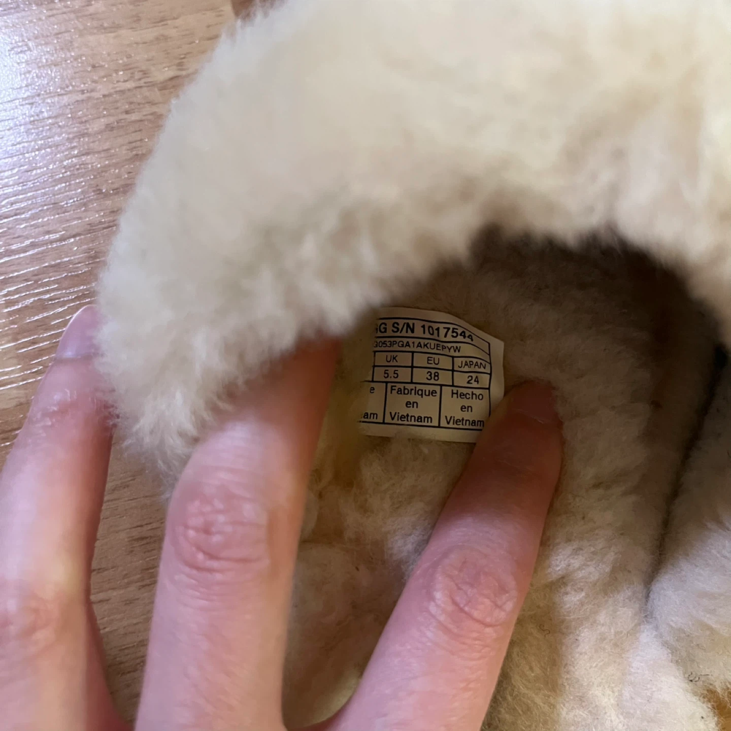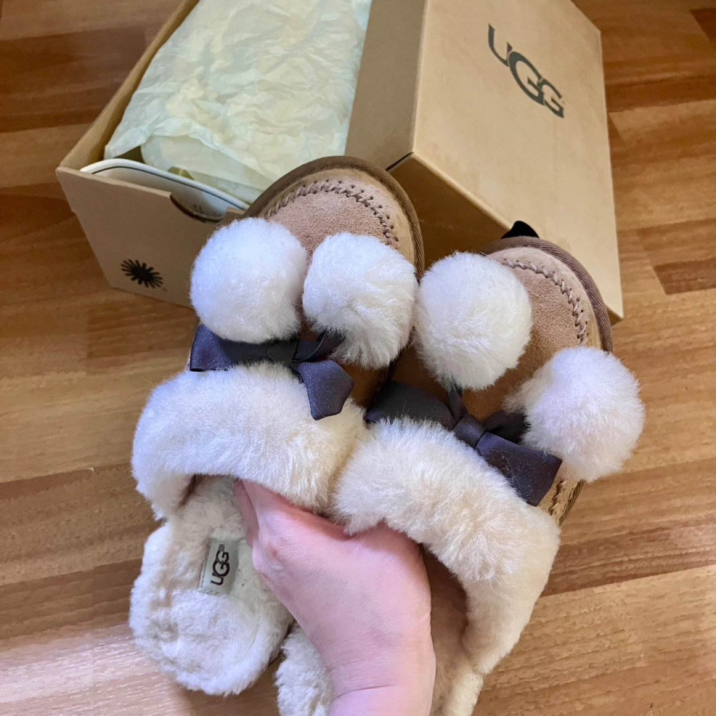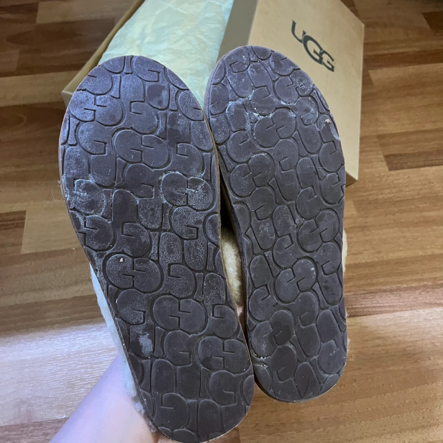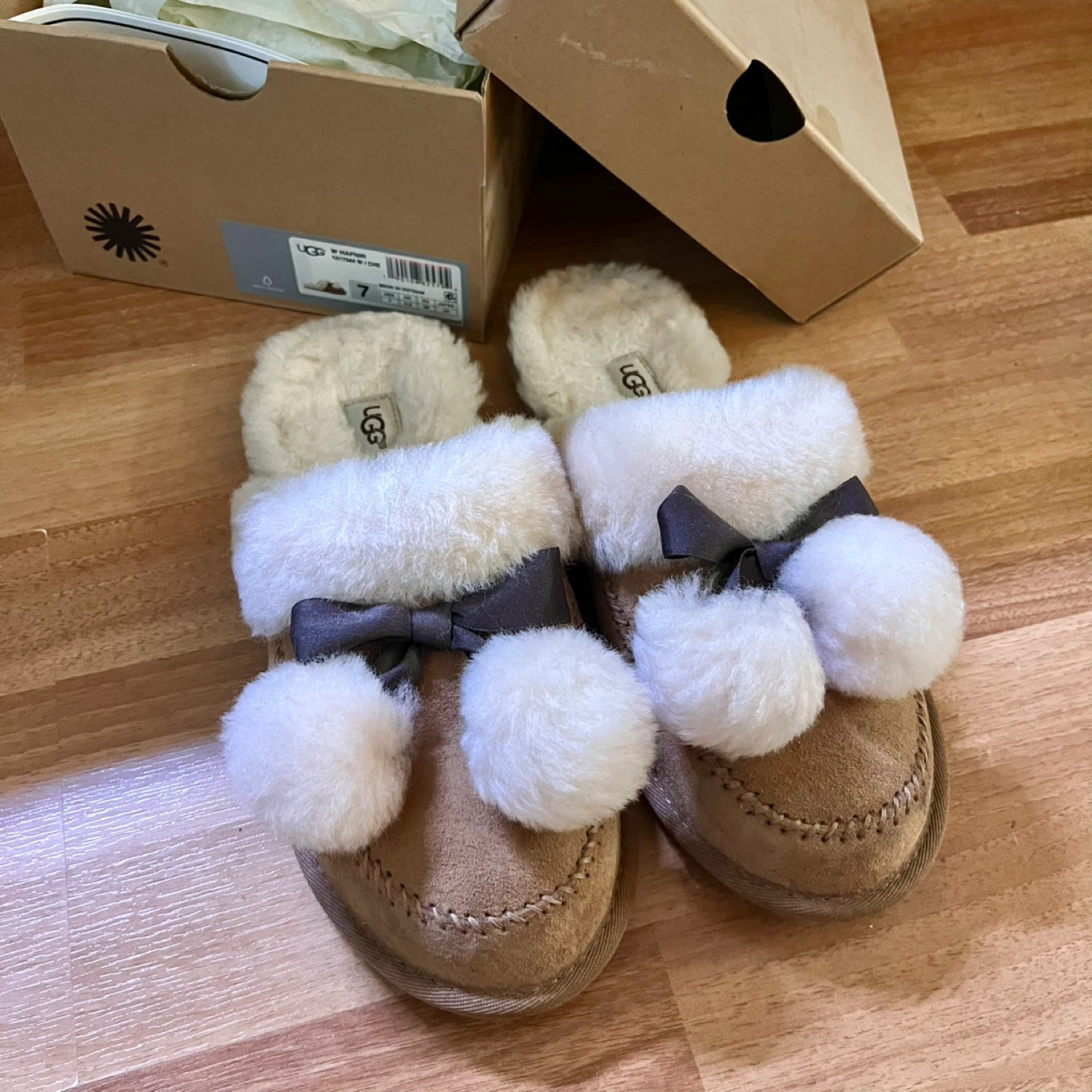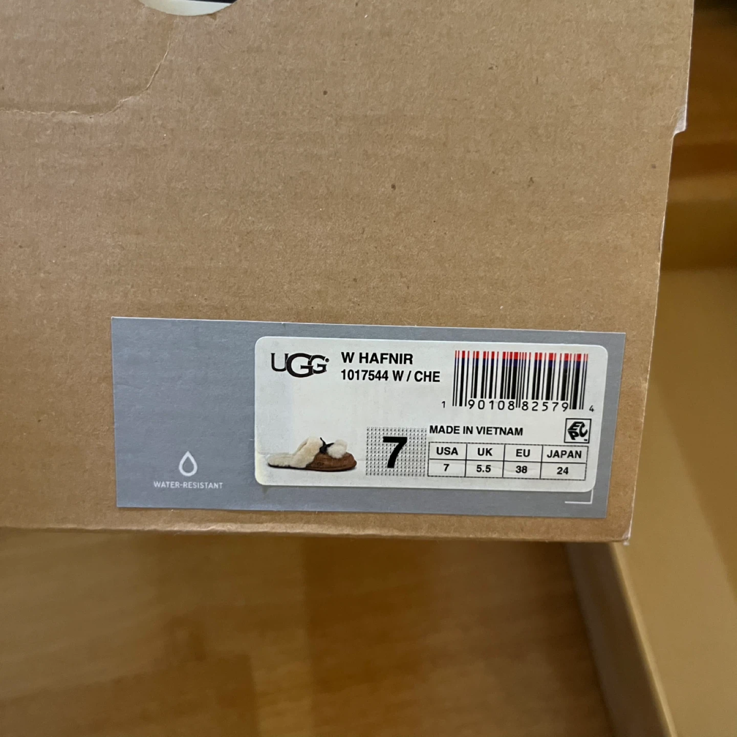 Selling a pair of UGG slippers in women's size 7! They're in great condition and come with the original box. These cozy slippers are perfect for keeping your feet warm and stylish around the house. The box indicates the model number is 1017544 and they are water-resistant