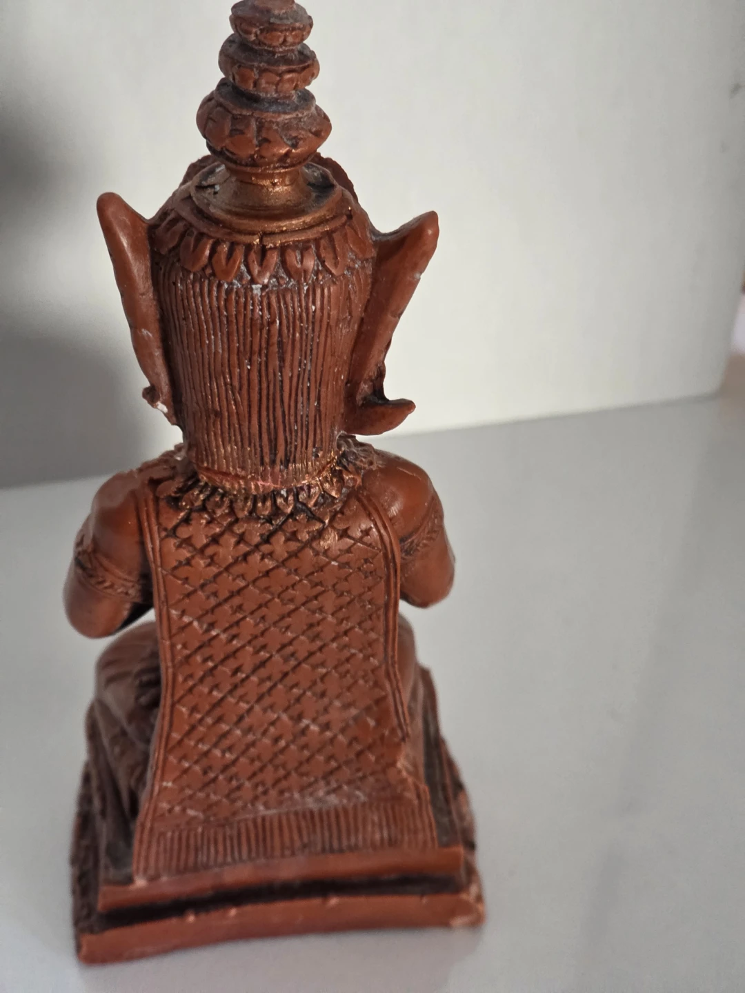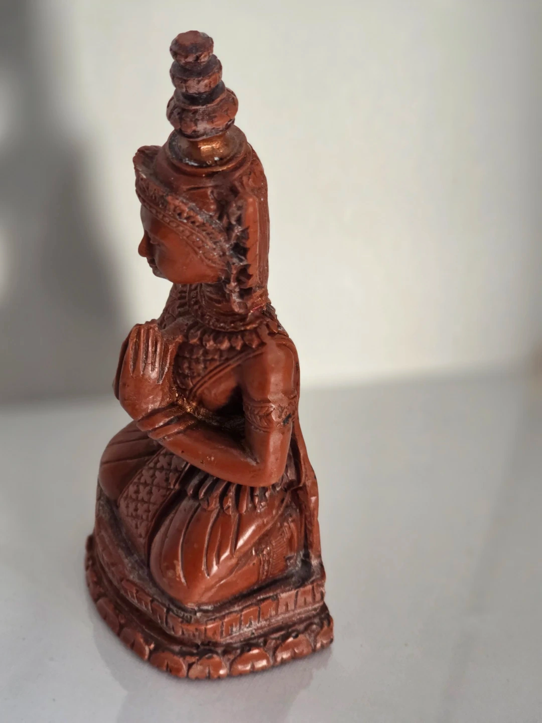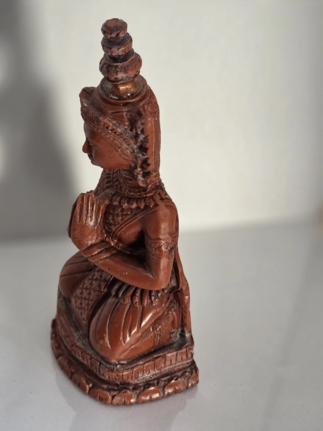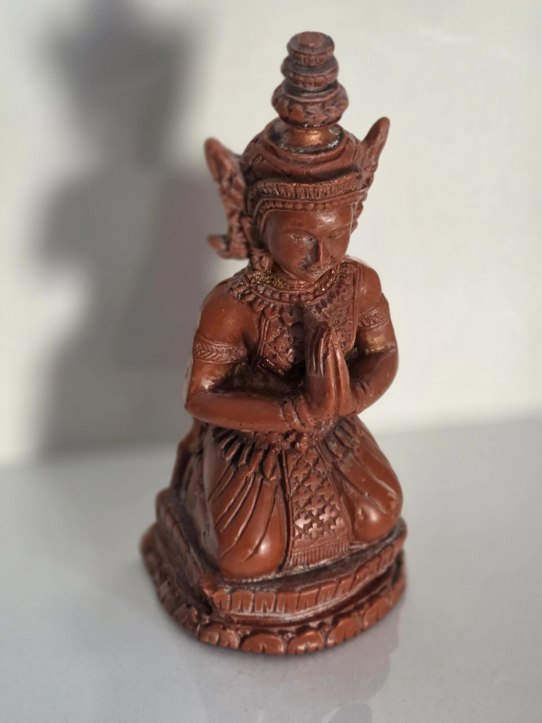 It is in a kneeling posture with hands pressed together in a wai (prayer/greeting) gesture.