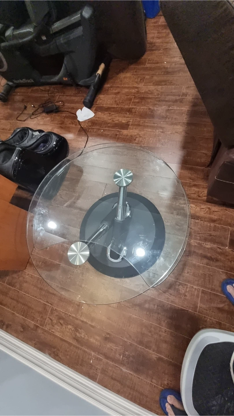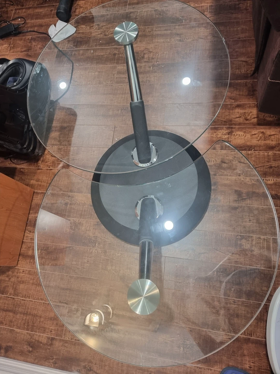 Selling a round glass coffee table with a black base. It's in good condition and would look great in any living room! The table has a modern design and is perfect for small spaces
