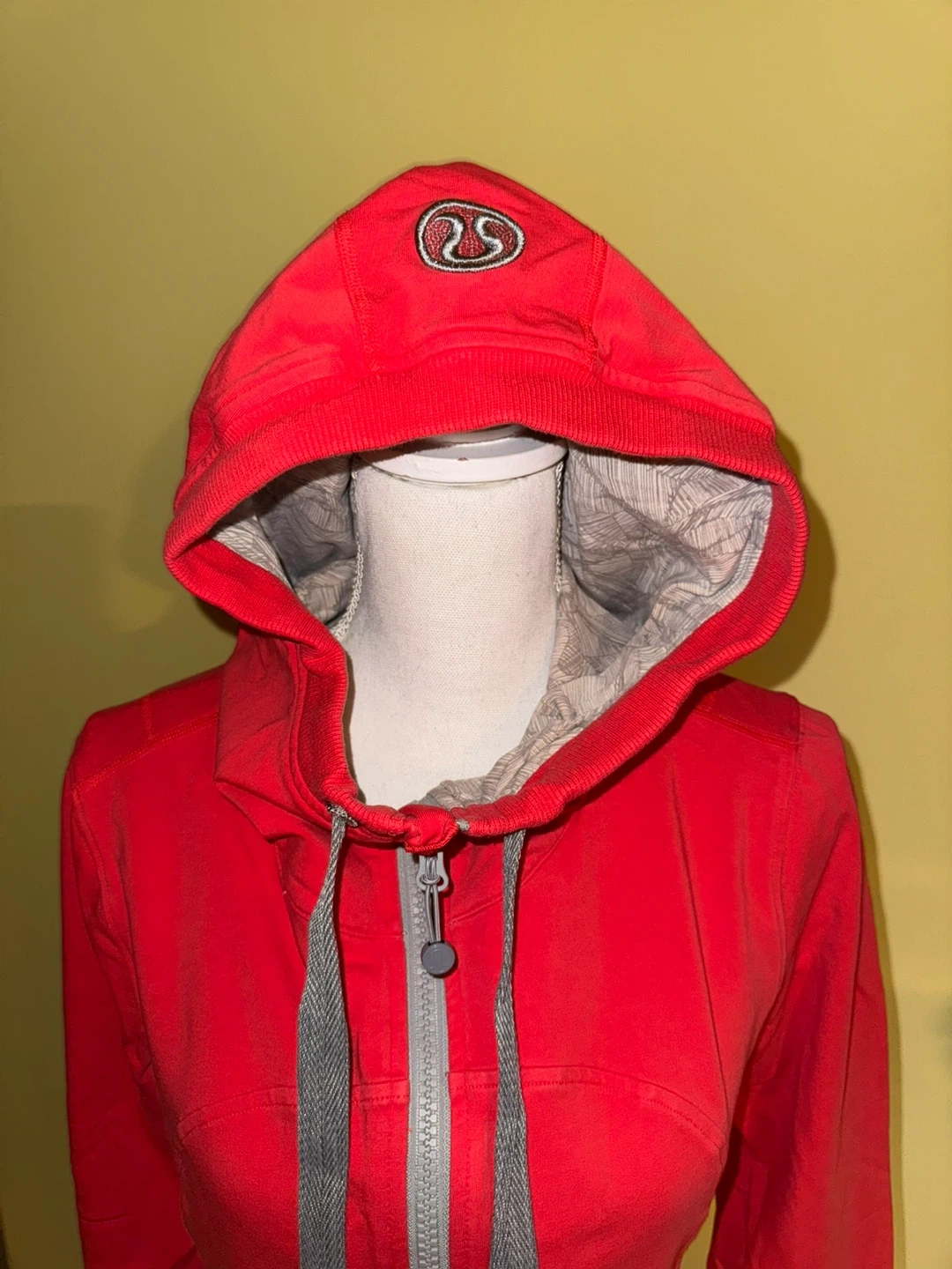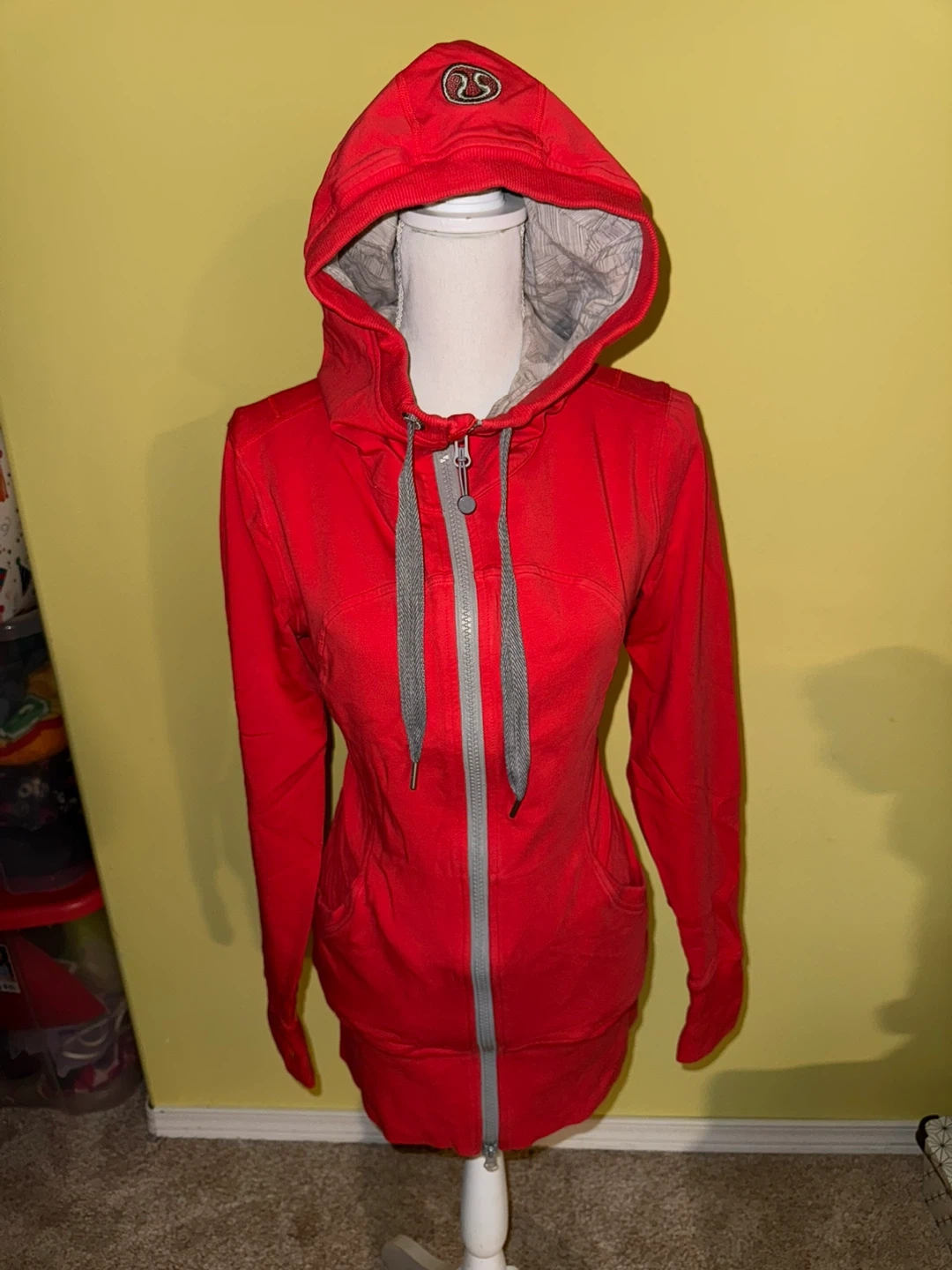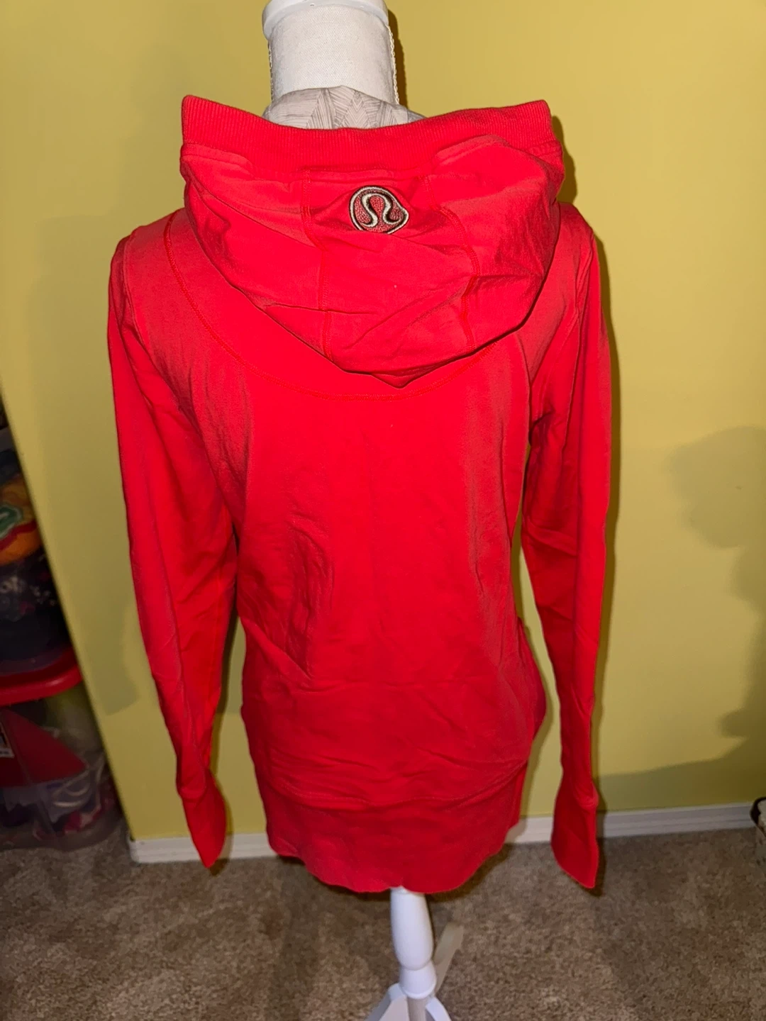 Selling a Lululemon Scuba Hoodie in a vibrant red colour! It's a size 12. The hoodie features thumbholes and a unique patterned lining. Perfect for workouts or casual wear!