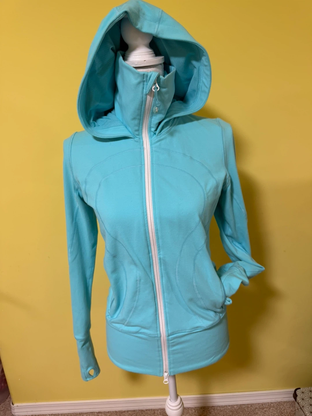 Selling a Lululemon Scuba Hoodie in a lovely turquoise colour! It's in great condition and features thumb holes for extra comfort on those chilly days. Perfect for workouts or just lounging around!
