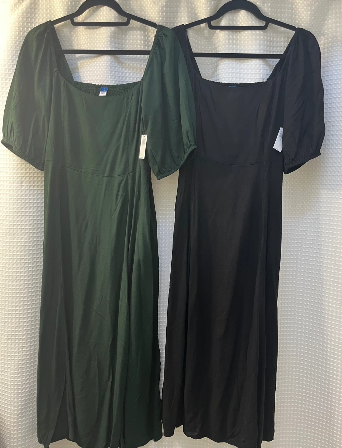 Two New Old Navy puff sleeve midi dresses available! One is a size large in green, and the other is a size medium in black. Both are in great condition and made of 100% rayon. $15 each.