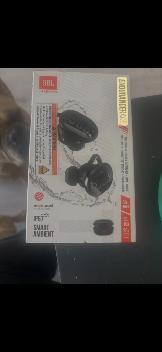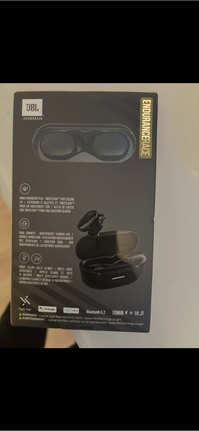 Selling a brand new pair of JBL Endurance Race wireless earbuds! These are perfect for workouts or everyday use. They are 100% wireless, waterproof, and sweatproof. They have up to 30 hours of playtime and feature smart ambient technology. Comes with the original box and accessories