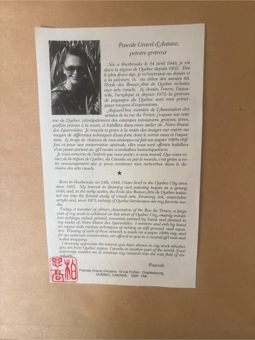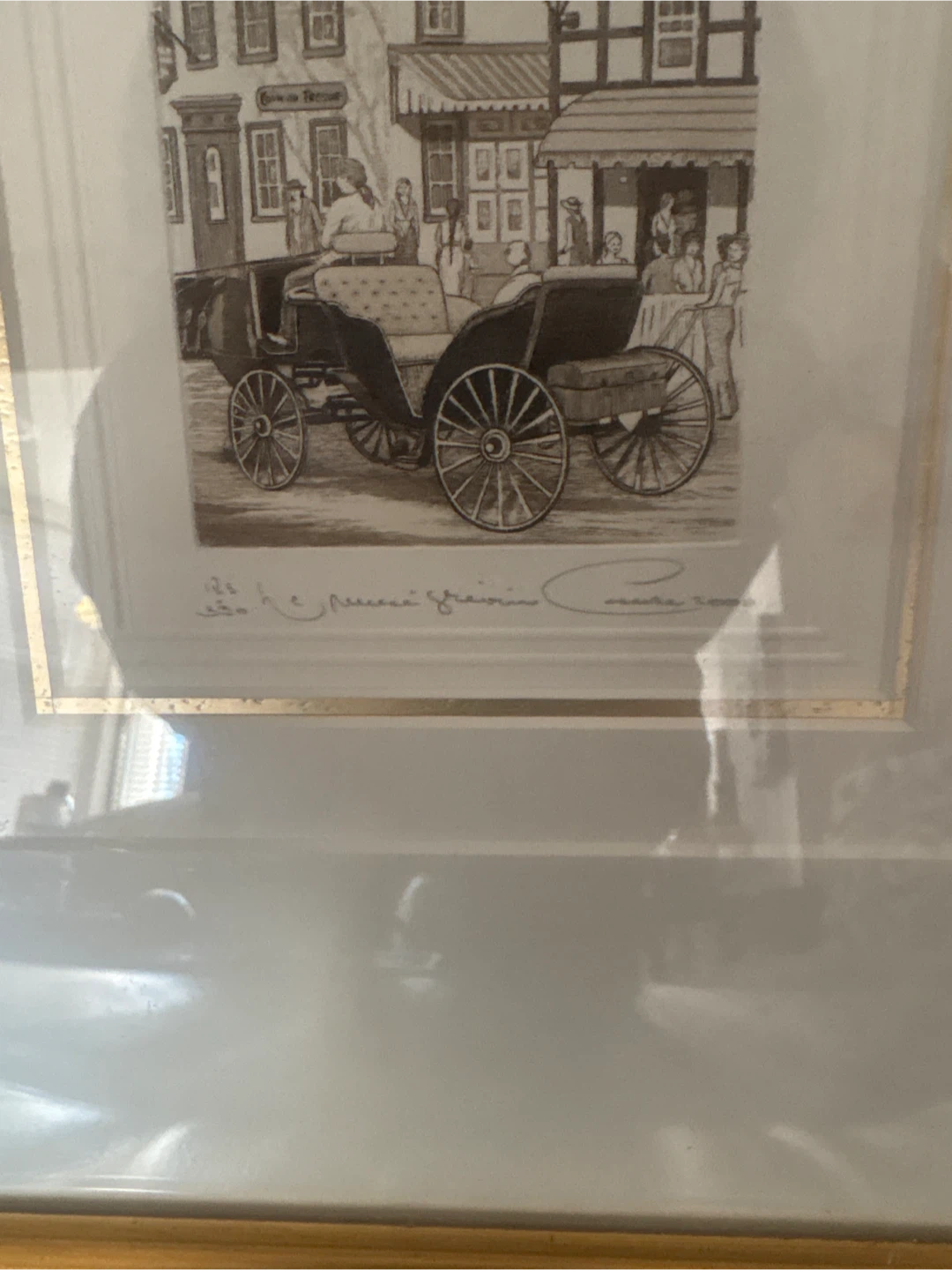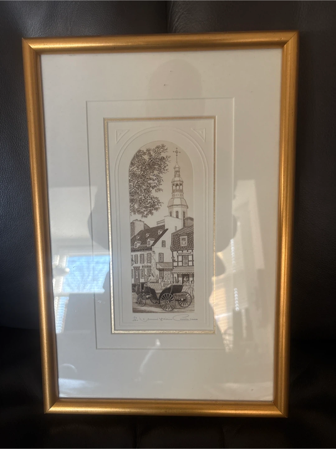 "🧡" Selling a framed art print by Pascal Gravel d'Autane. The print features a detailed illustration of a street scene with a horse-drawn carriage and architecture reminiscent of Old Quebec. The frame is gold-toned and complements the black and white artwork nicely. A lovely piece to add a touch of classic charm to any room