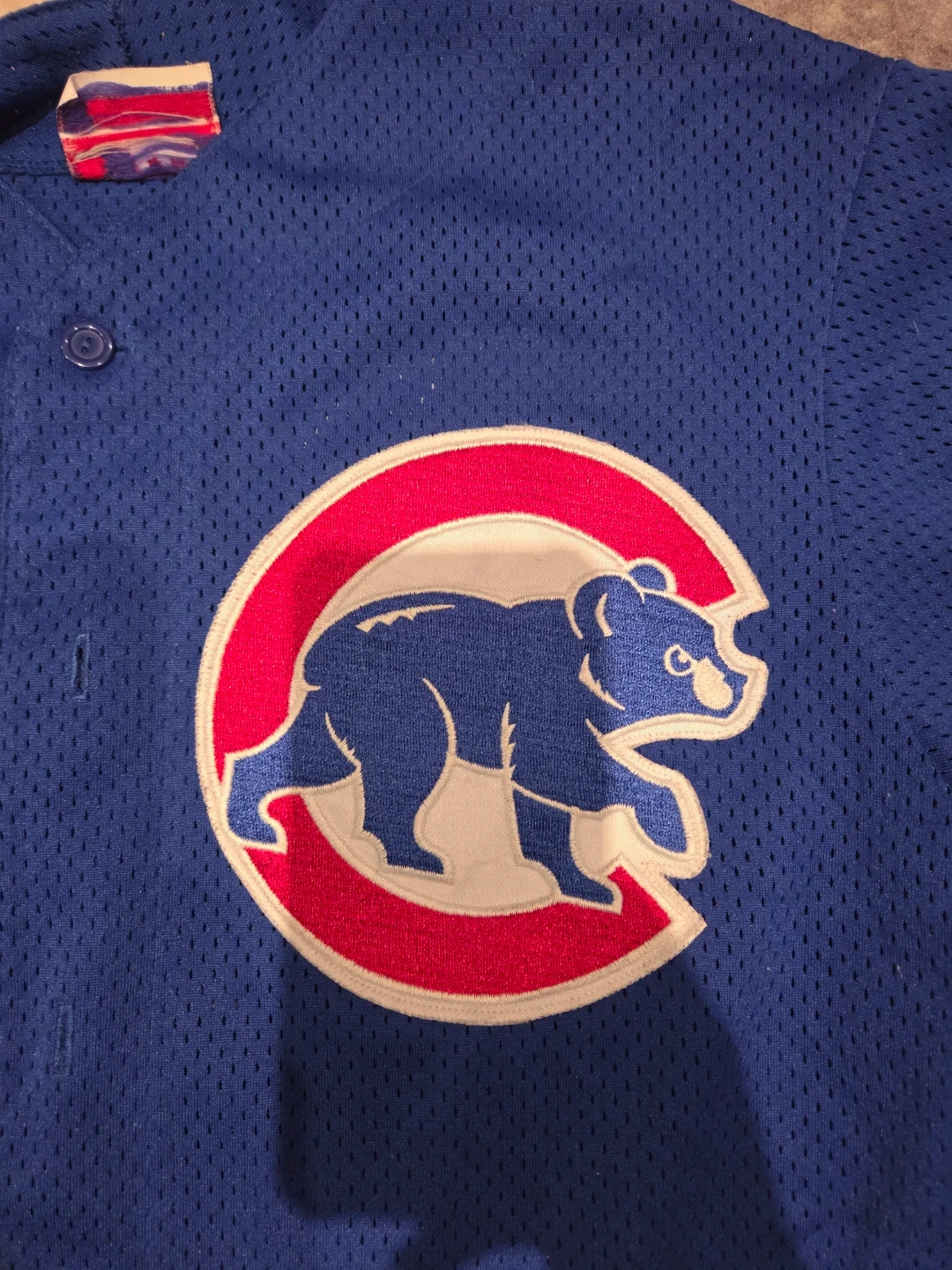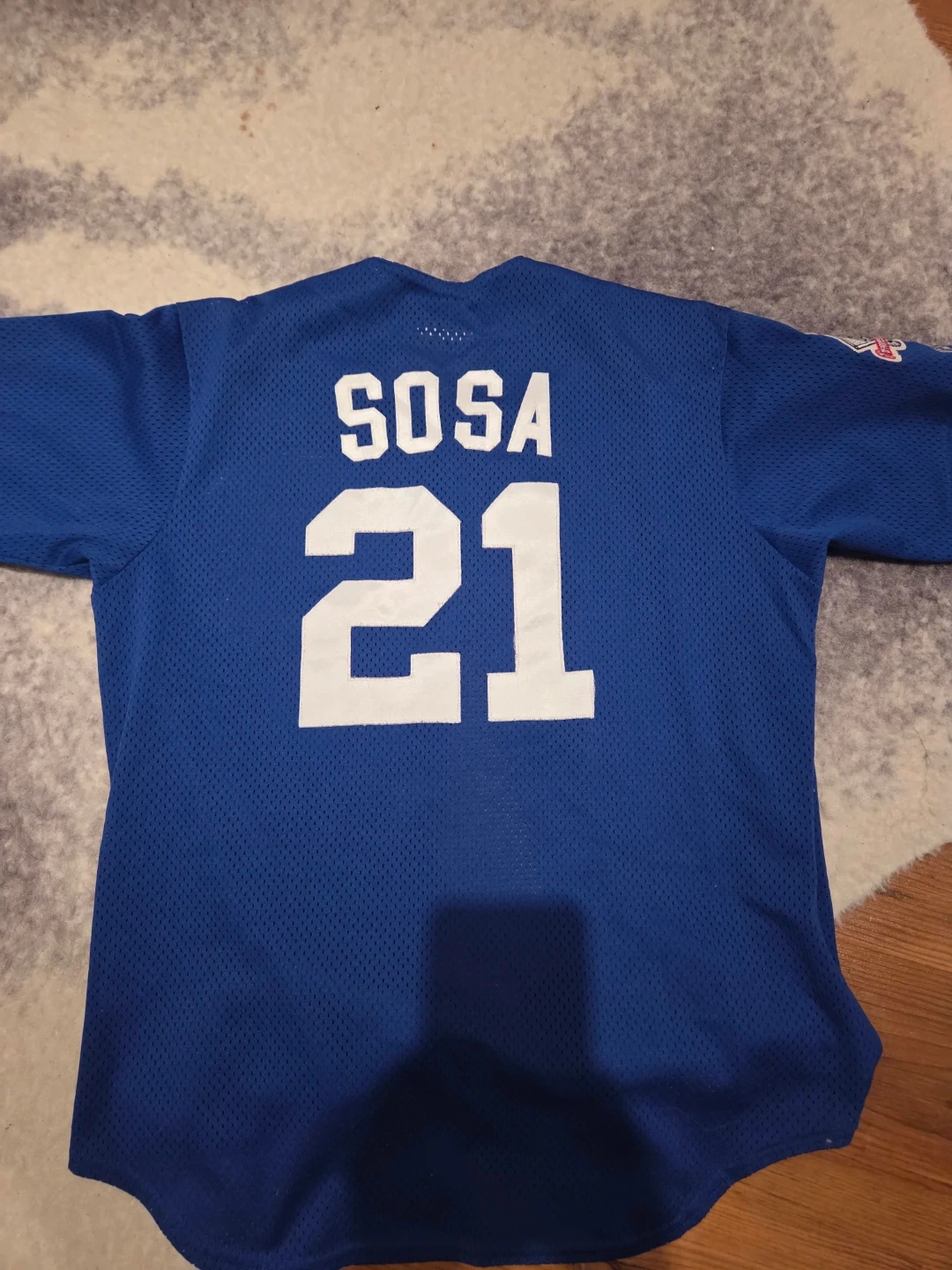 Selling a Chicago Cubs jersey, featuring Sosa #21 on the back! It's a blue Majestic Athletic jersey with the Cubs logo on the front and a commemorative patch on the sleeve