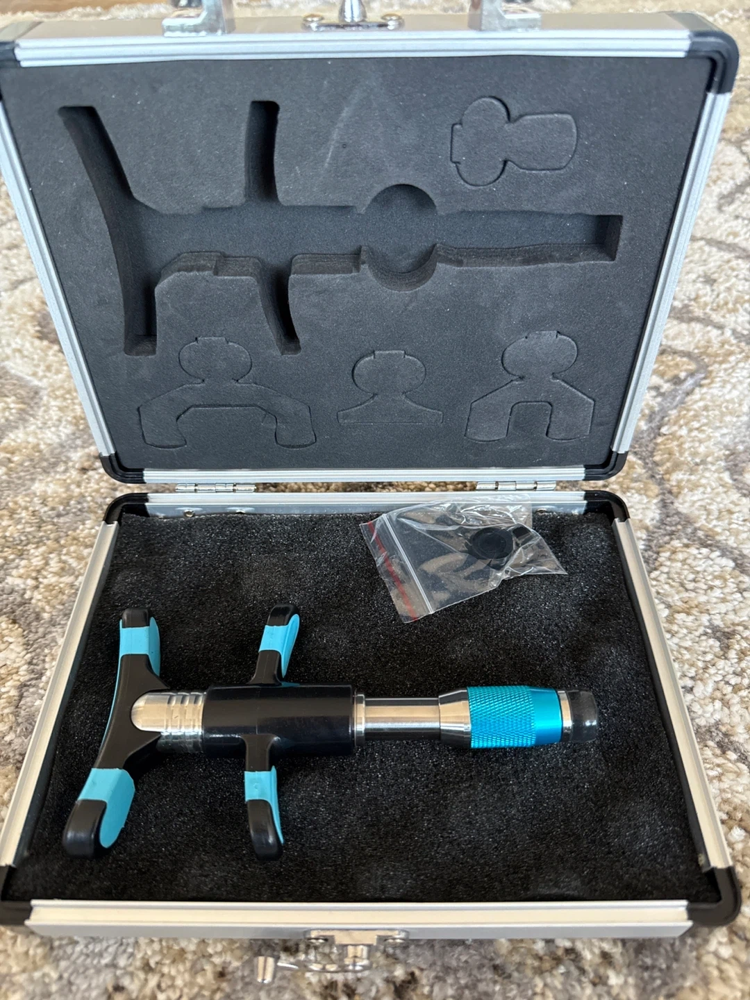 Chiropractic adjusting tool in excellent condition, comes with its original case. It's ready to help with adjustments and alignments. It includes the tool itself and some accessories in a small bag. The case has custom foam inserts to keep everything organized and protected