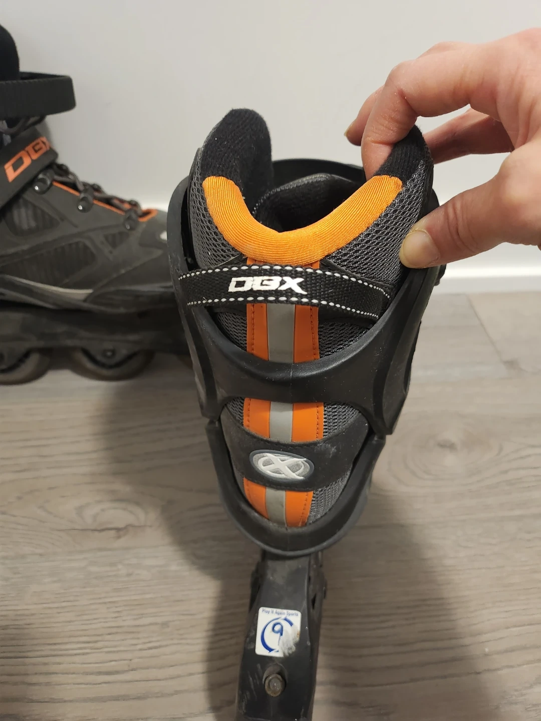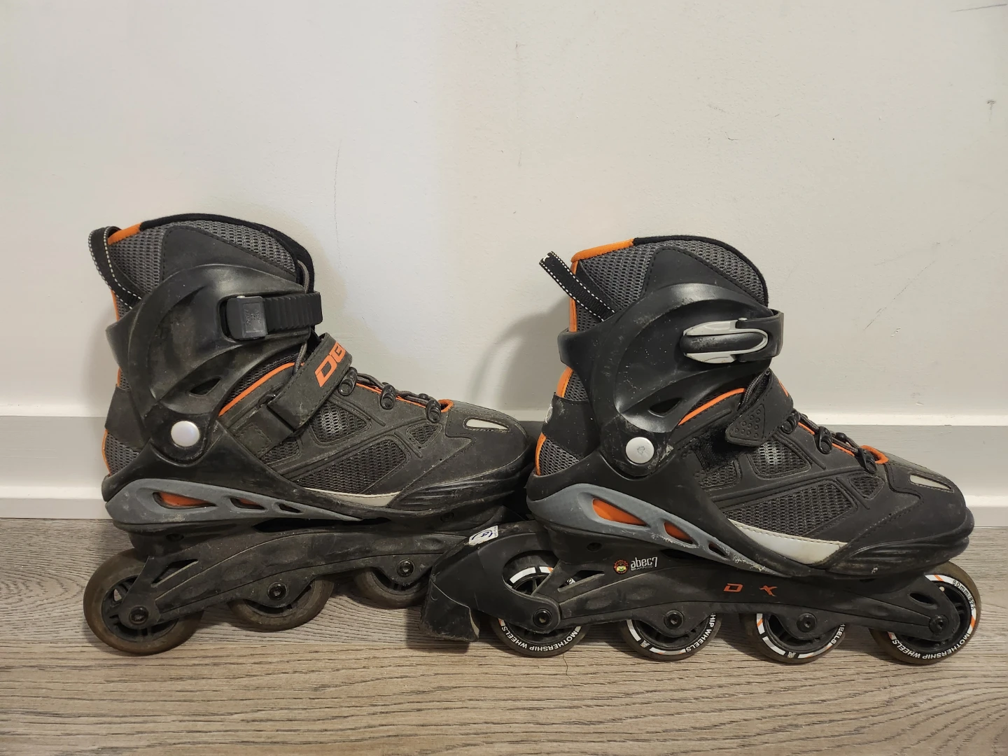 Selling a pair of DGX rollerblades in size 9. They show some signs of use, but are still in good working condition for cruising around the neighbourhood or hitting the skate park. These rollerblades are black with orange accents.