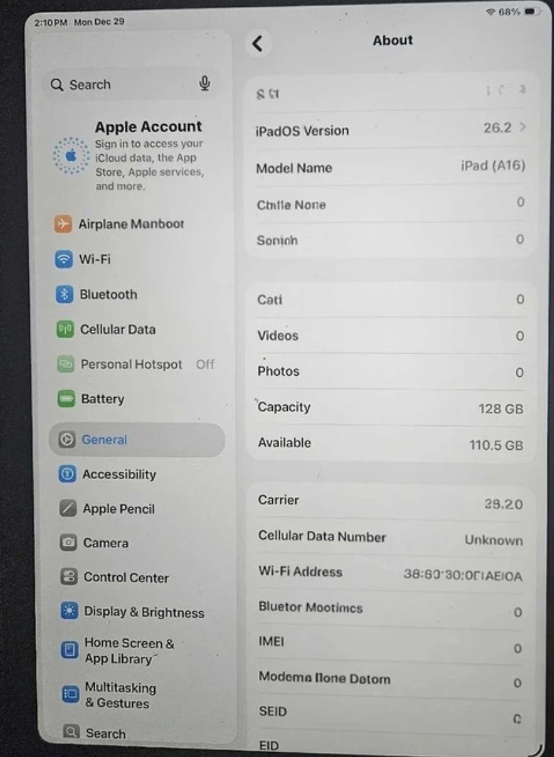 Selling an iPad (A16) with 128GB of storage. The battery health is at 100% with 45 cycle counts. Manufacture date is January 2025 and first use was June 2025. There are some scratches on the back. A couple of dents but none of them are effecting the screen or glass. The glass is mint still.